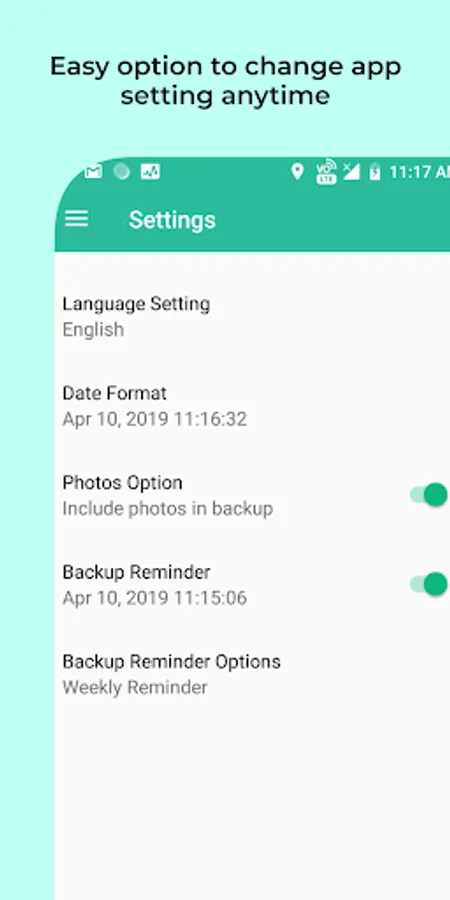 ● Provide option to set backup reminder weekly or monthly to take regular backups.