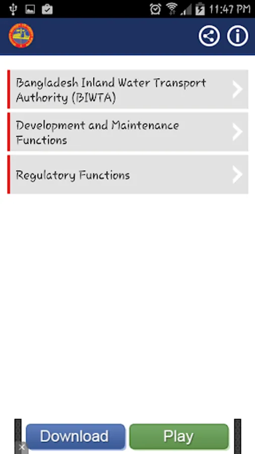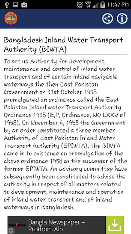 Water transport is one of the major transport systems in the land of river like Bangladesh. BIWTA act as The Authority performs statutory functions of development, maintenance and regulatory nature. This application is having the information of fare of water rout and the BIWTA’s countrywide office addresses with contacts.