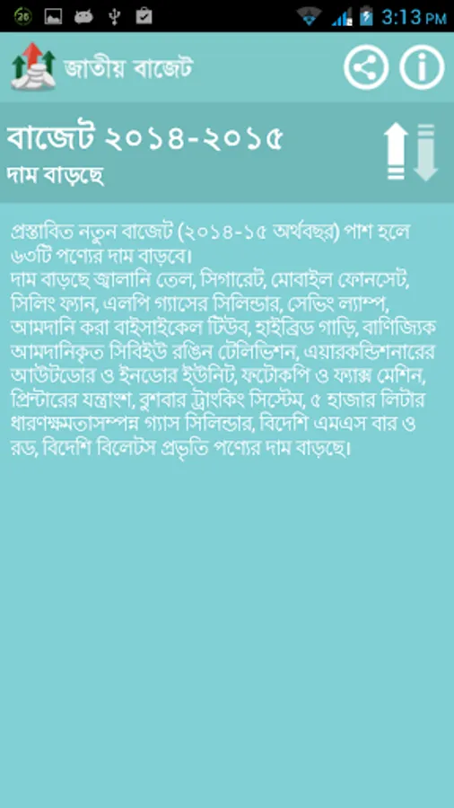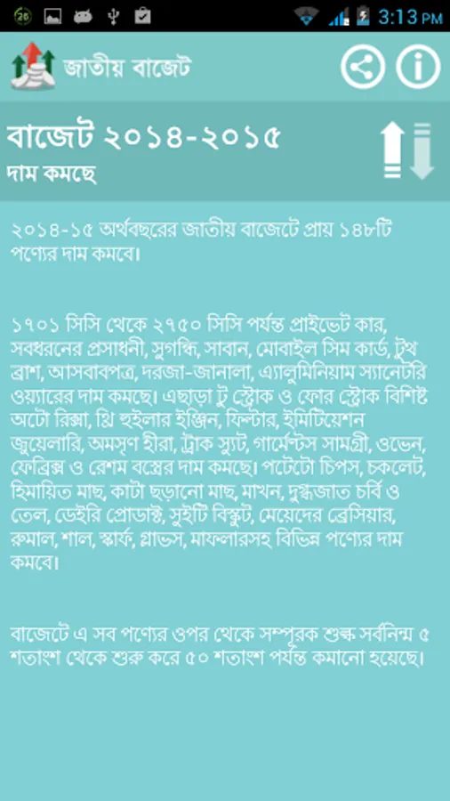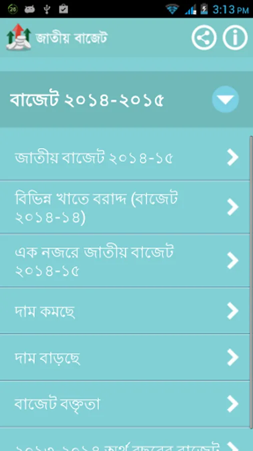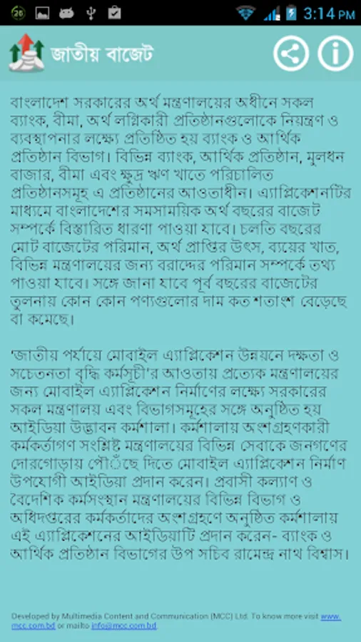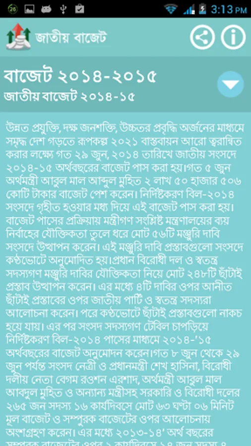 This APP constitutes of the financial budget of Bangladesh of the contemporary year with detailed information such as the total budget of the year, the resources of income, the expenditure excavate, the allocation for different ministries etc. It will also present the comparison of budget of the current year with the preceding year and the rate of inflation.
