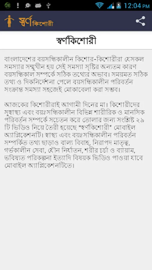 আজকের কিশোরীরাই আগামী দিনের মা। কিশোরীদের সুস্বাস্থ্য এবং বয়ঃসন্ধিকালীন বিভিন্ন শারীরিক ও মানসিক পরিবত©ন সম্পর্কে সচেতন করে তোলার জন্য সংশ্লিষ্ট ২৯ টি ভিডিও নিয়ে তৈরী হয়েছে “স্বণ© কিশোরী” মোবাইল অ্যাপ্লিকেশনটি। স্বাস্থ্য এবং বয়ঃসন্ধিকালীন পরিবত©ন সম্পর্কিত তথ্য ছাড়াও বাল্য বিবাহ, নিরাপদ মাতৃত্ব, গভ©কালীন সেবা, যৌন নির্যাতন, শরীর চর্চা ও ব্যায়াম, ভবিষ্যত পরিকল্পনা ইত্যাদি বিষয়ক ভিডিও পাওয়া যাবে মোবাইল অ্যাপ্লিকেশনটিতে।