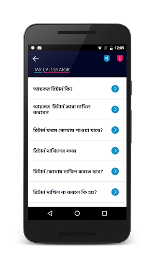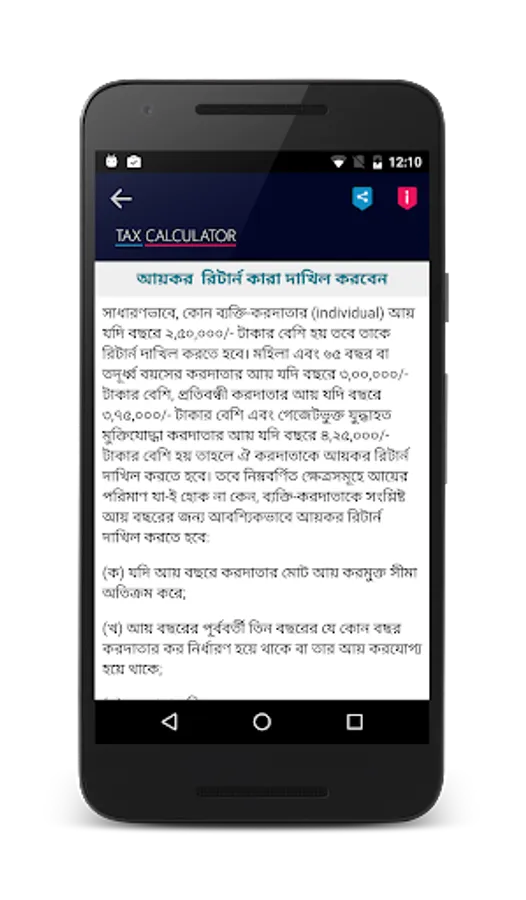 The National Board of Revenue (NBR) is the central authority for tax administration in Bangladesh.The main responsibility of NBR is to collect domestic revenue (primarily, Import Duties and Taxes, VAT and Income Tax ) for the government.Through this application, how much money you have to pay taxes on the amount of income that can be calculated easily. In addition to the submission of income tax calculated based on the tax area code, spot Assessment Guide, tax return guidelines would know about.