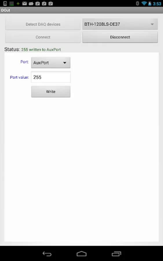 The Digital Output app demonstrates the use of the Universal Library for Android™ API to write a value to a digital port on a Measurement Computing (MCC) data acquisition device (USB, Bluetooth or Ethernet).