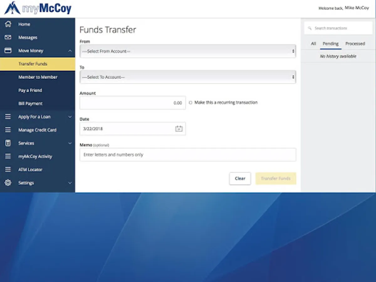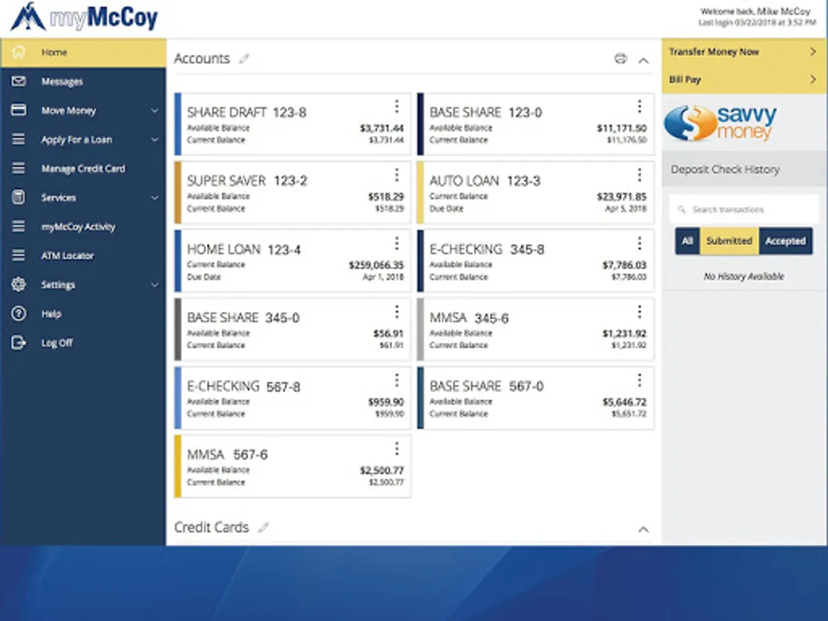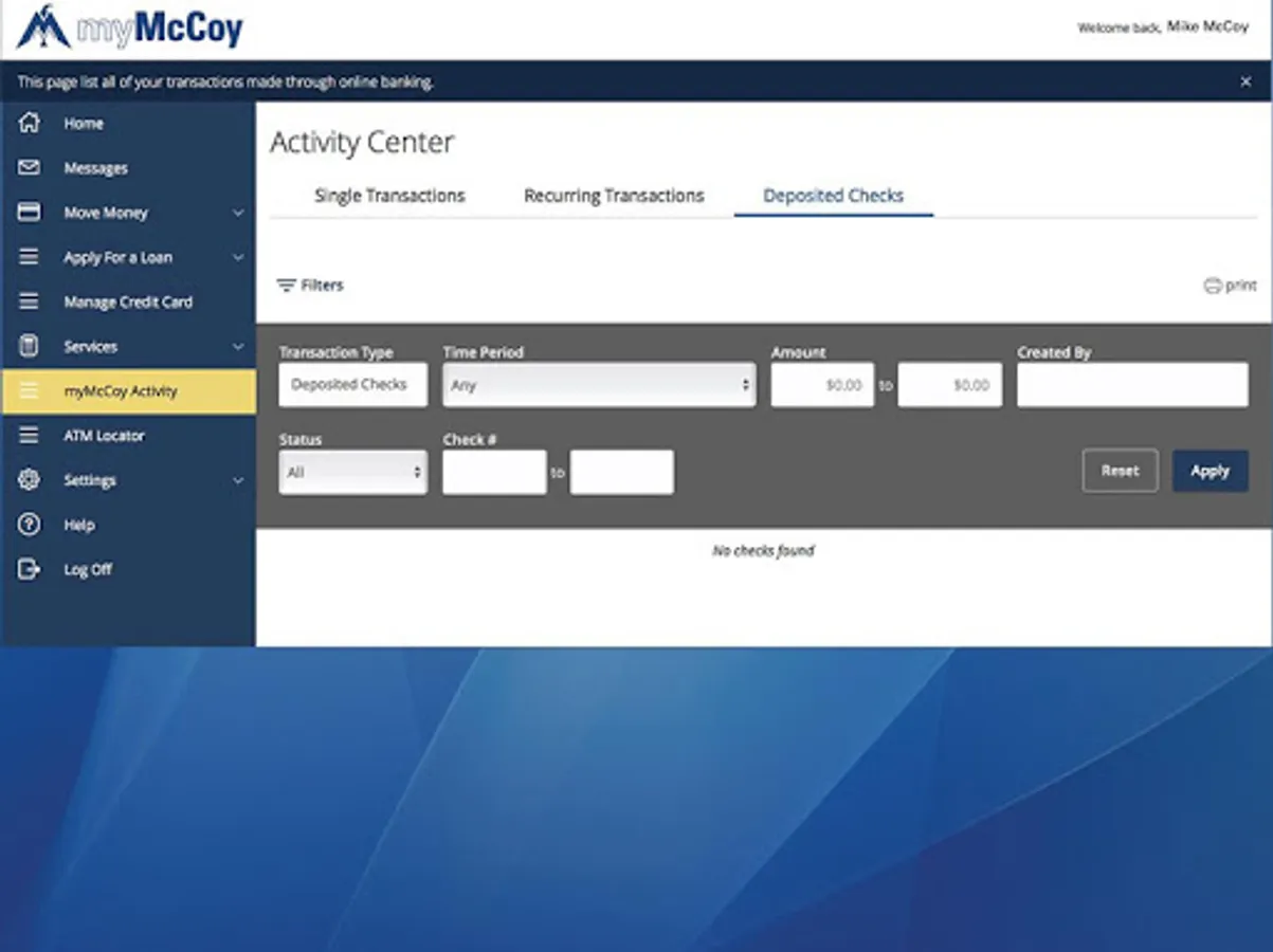myMcCoy Mobile has been improved with you in mind with enhanced online banking features a streamlined workflow and added functionality. Our mobile banking application offers a fresh, modern design, making it fast and easy to use. You can check balances, transfer funds, view transactions and make deposits from anywhere, anytime. It's fast, free and available to all of our online banking users.