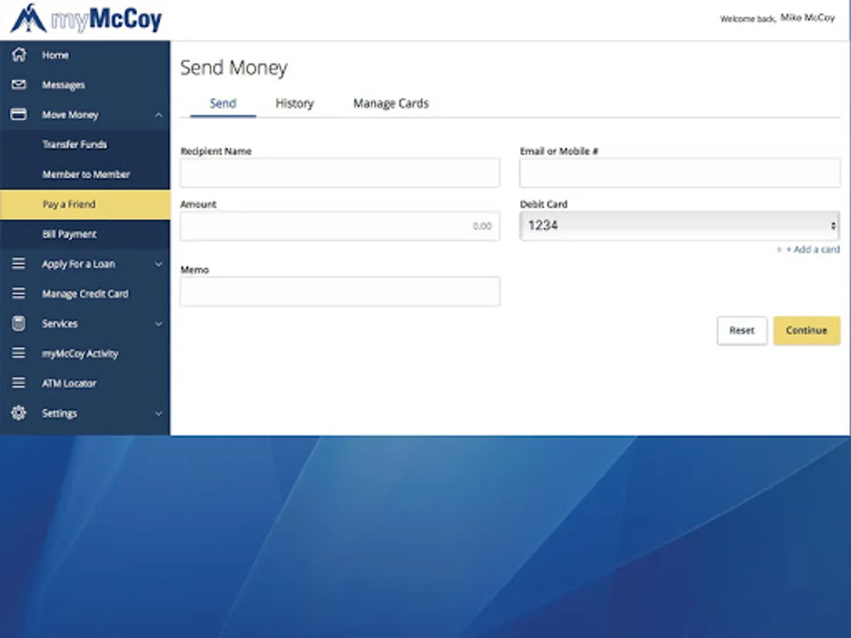 - Pay friends and family or receive money conveniently with McCoy P2P payments