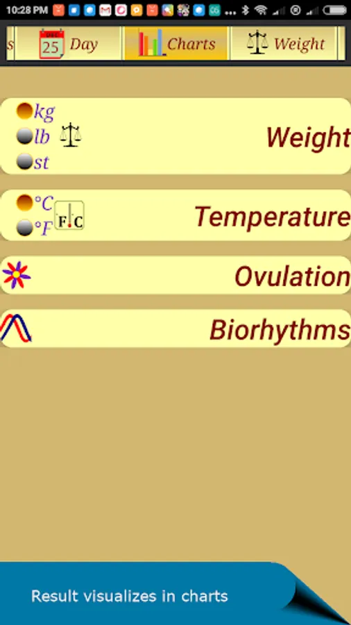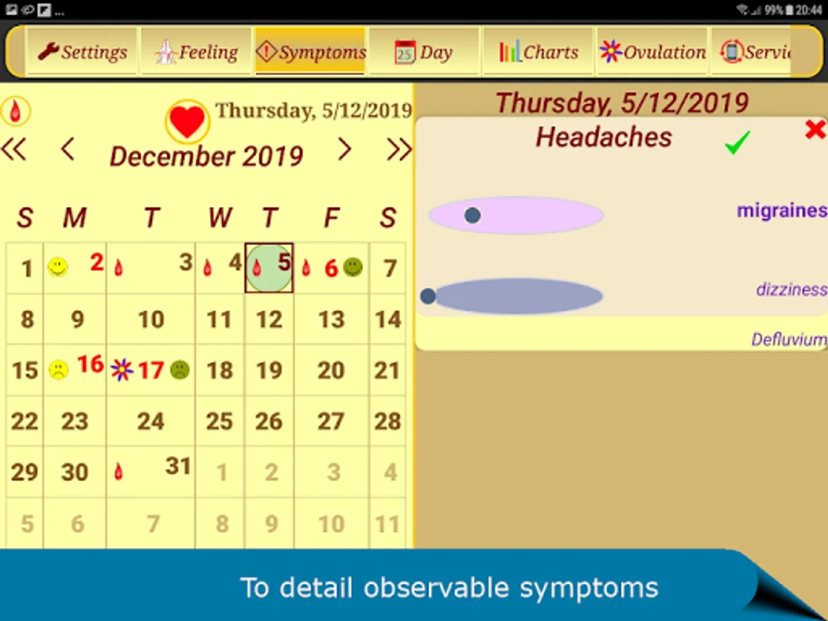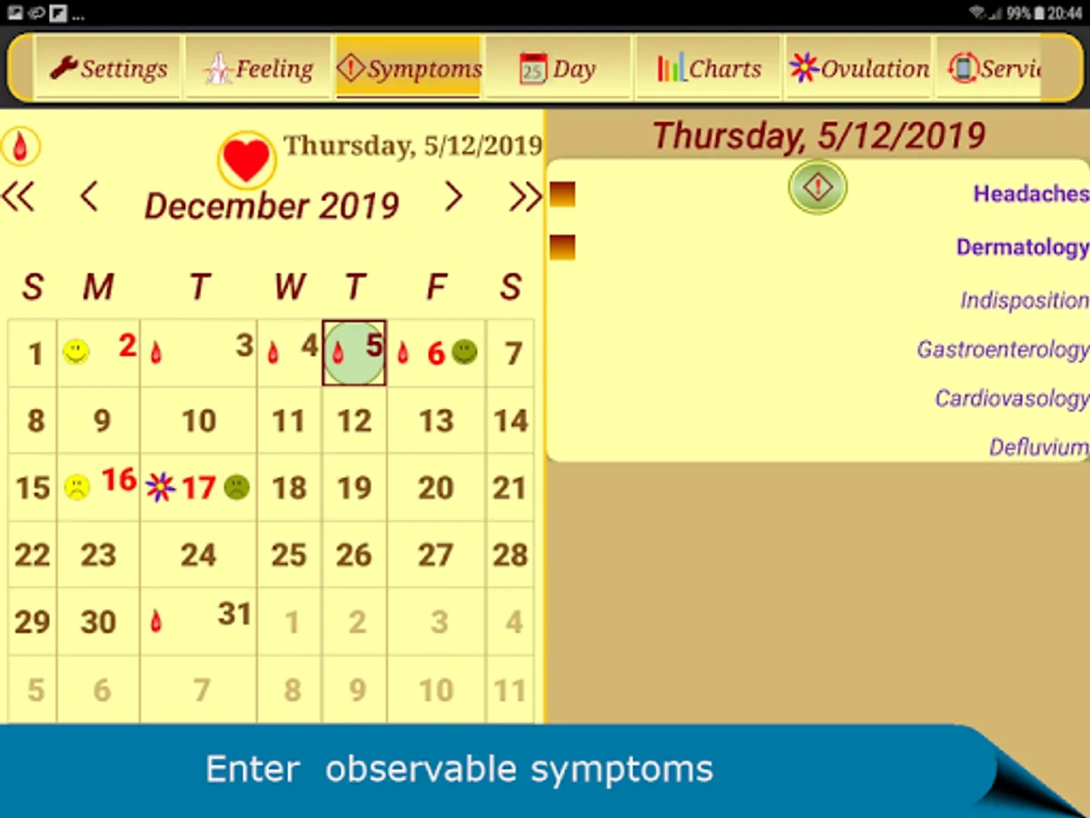► Women's intimate calendar allows you enter keep information on intensity of flows, symptoms, moods, temperature, weight, PMS, unprotected sex events and other diary notes