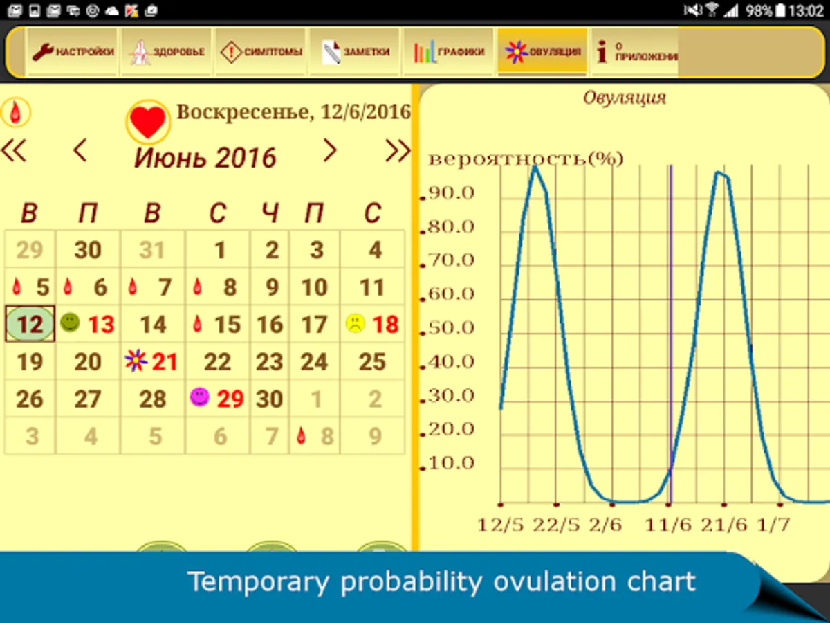 ► Visualization of the ovulation the probability and other vital important data in convenient charts