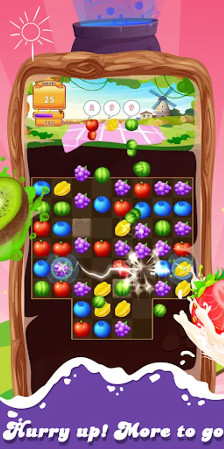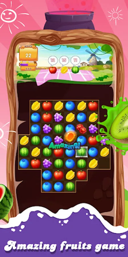 π Match more than 3 fresh fruits, and if possible, create 5 in a row to create a colorful fruits that can blast all one type of fruits on the board.