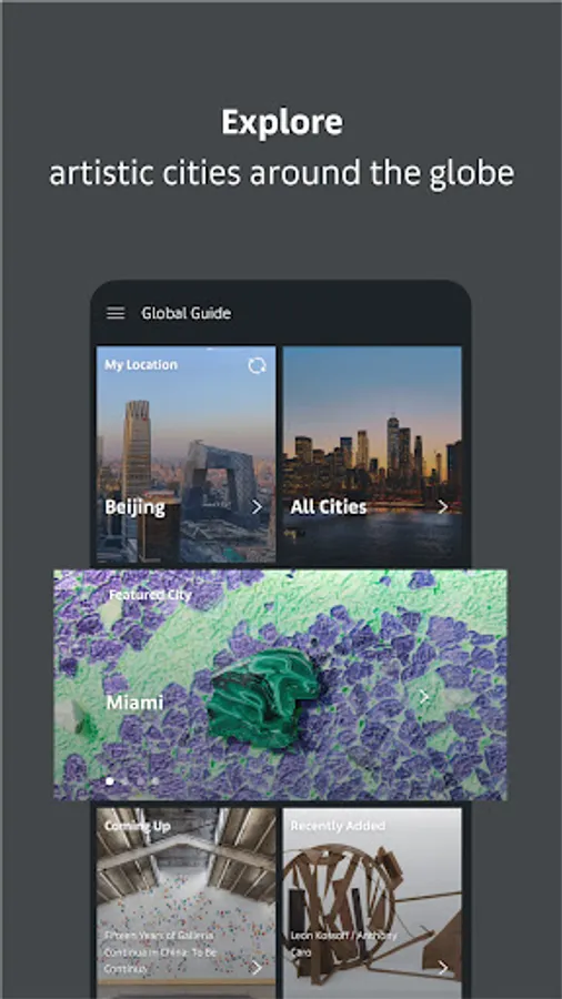 Or let us guide you around the world with the Art Basel global guide with geo location support. Discover Galleries, Museums, Cultural Institutions, Restaurant & Bars, and more.