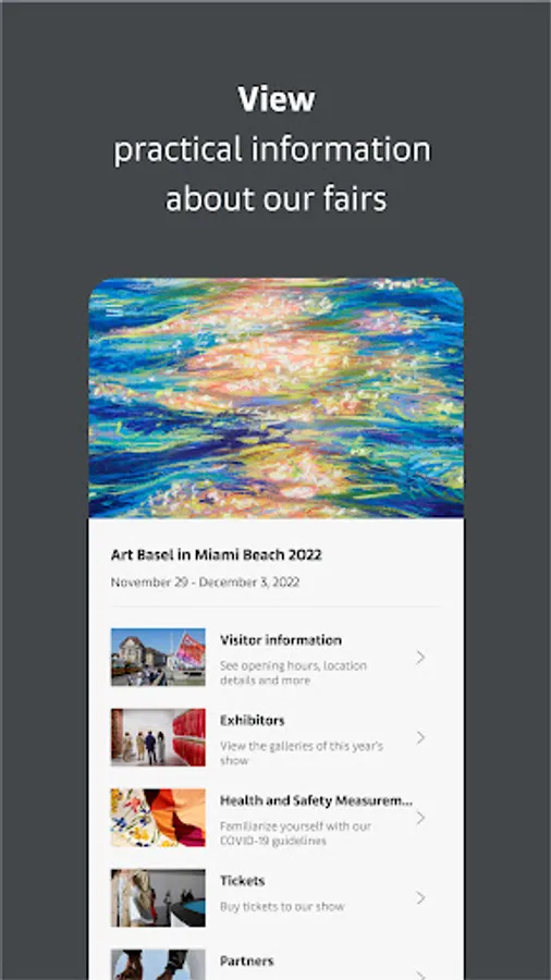This is the official Art Basel app, featuring essential show information, news and updates from Art Basel, a catalog of artworks and galleries participating at the show, interactive floorplans, and events listings for every show.