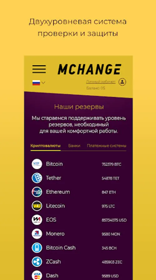 - Large reserves of cryptocurrencies, electronic currencies and fiat. In case of a shortage, the reserve is quickly replenished by the service at the request of the user.