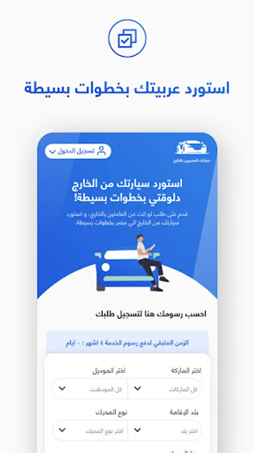 The Cars of Egyptians Abroad application provides you with the feature of requesting to import a car from your country of residence, and also provides you with the feature of calculating fees and tracking the application until the issuance of your import approval.