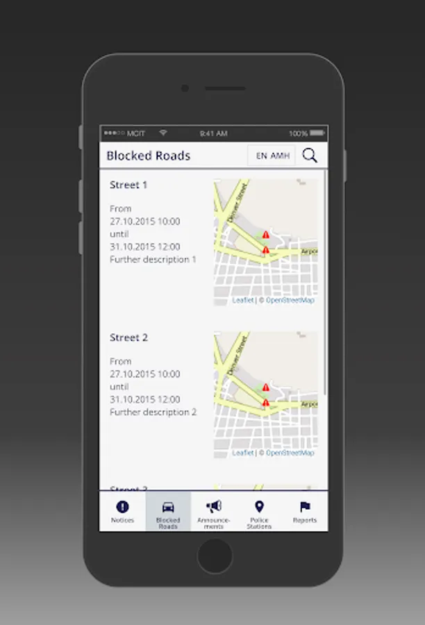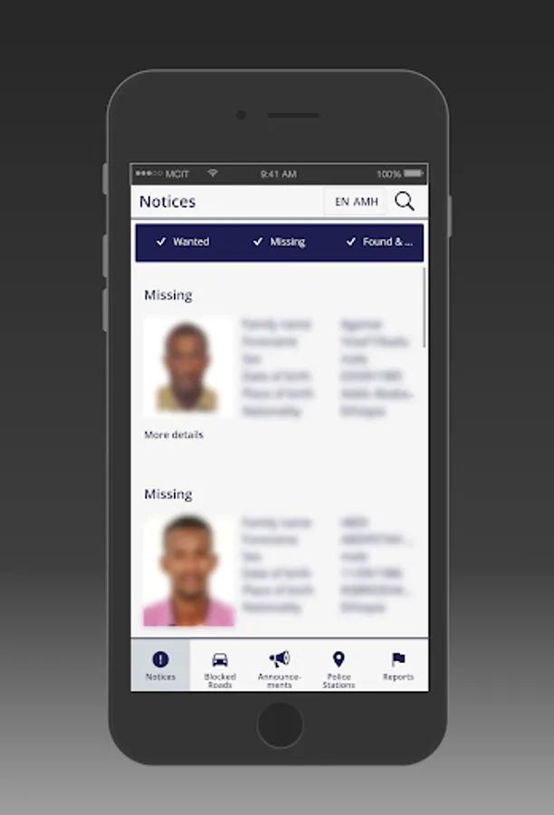 The Police app allows users to view notices with information on Wanted, Missing as well as Dead & Found people; roads that are temporarily blocked for various security reasons; announcements from the federal police; police stations on a map as well as important police phone numbers. It also enables a user to report any type of incident.