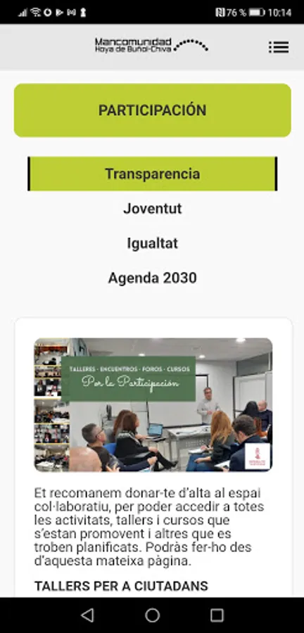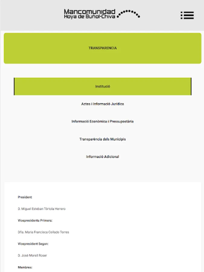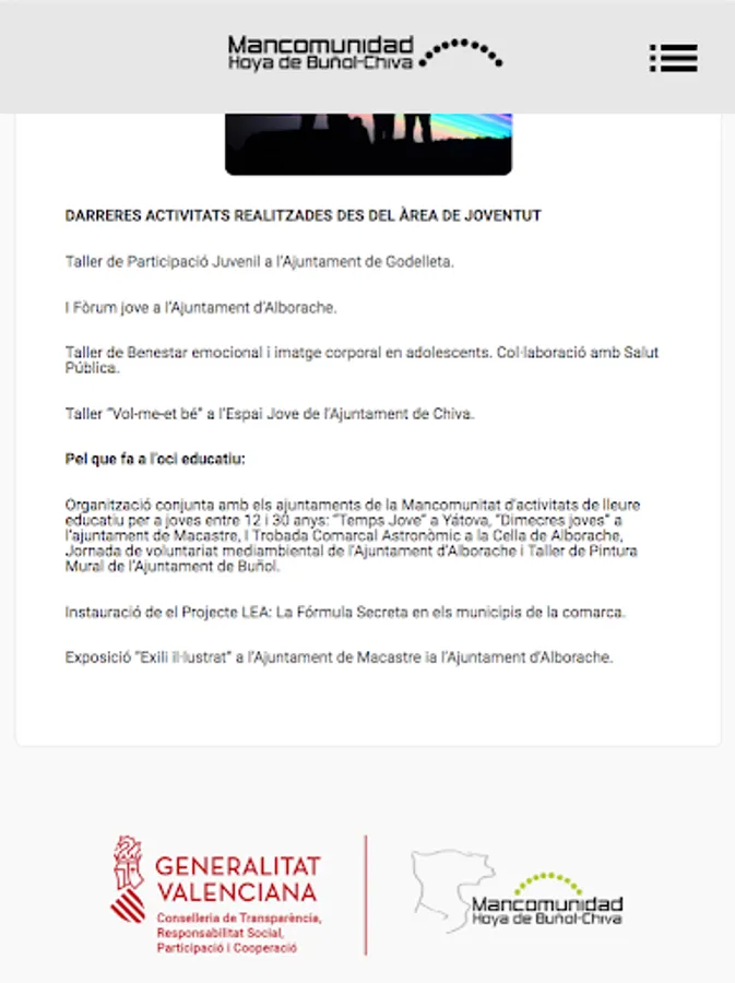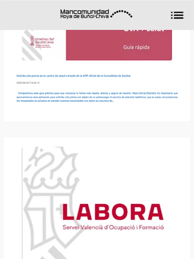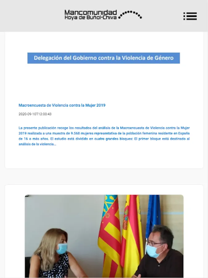The App of the Mancomunidad de la Hoya de Buñol-Chiva is a mirror mobile application, which means that its content will be based on that published on the website of the public institution. It is therefore an information consultation platform for smartphones and tablets. Thus, by launching this mobile application, the Mancomunidad, with the collaboration of the Conselleria de Transparència, Responsabilitat Social, Participació i Cooperació of the Generalitat Valenciana, seeks to adapt to the new forms of consumption and communication needs of citizens.
