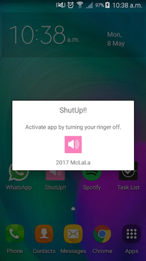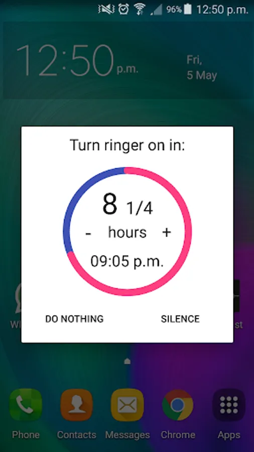 Change the ringer mode to mute or vibrate, and the app automatically pops up asking you for how long to stay silent.