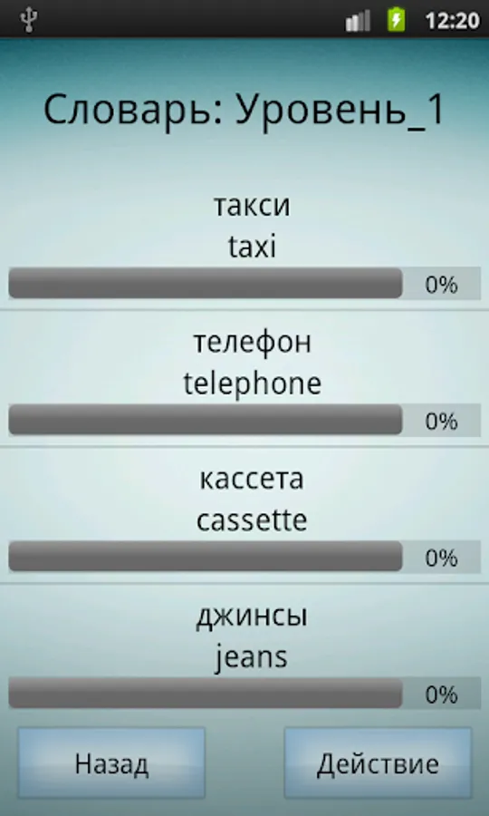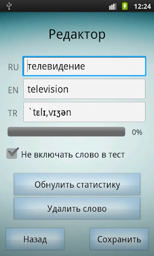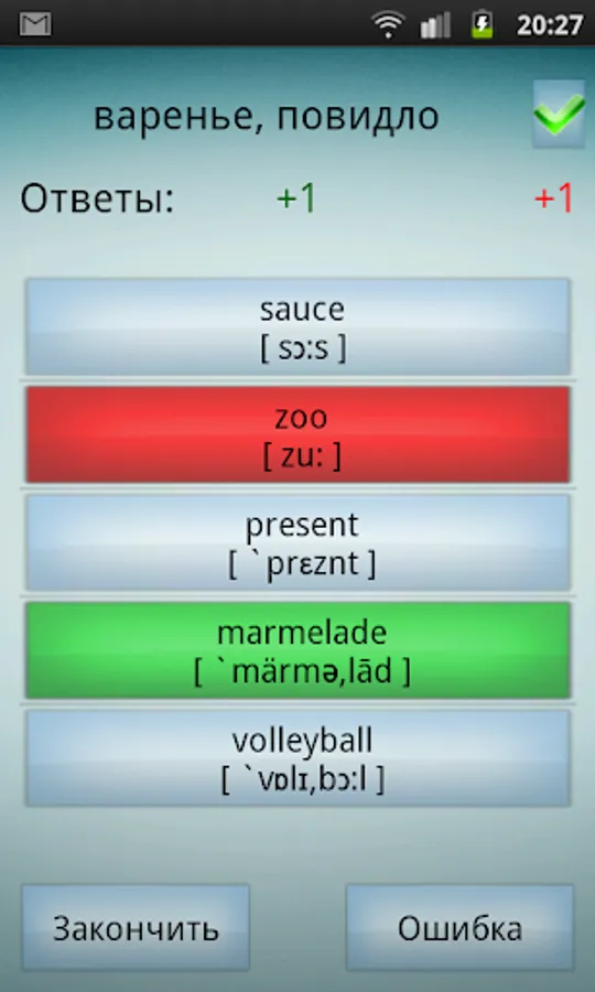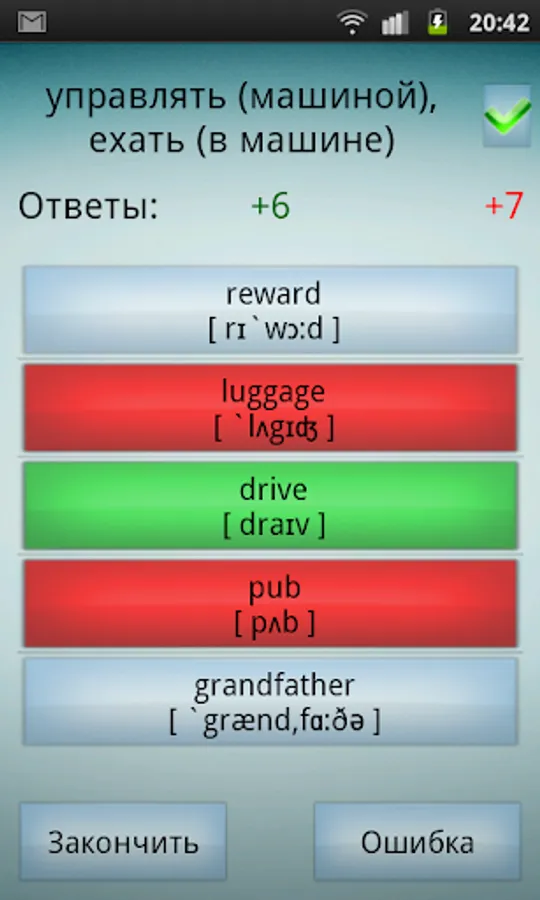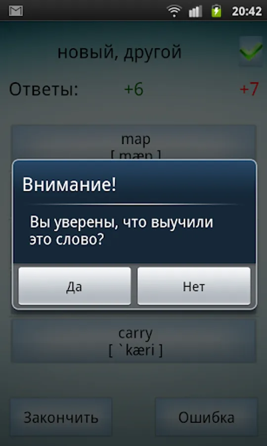 The new application has the ability to pause to remember the words. If you wrongly mark the word, before you will be given a new word, you will see a box with the word in English and Russian languages, as well as its transcription.