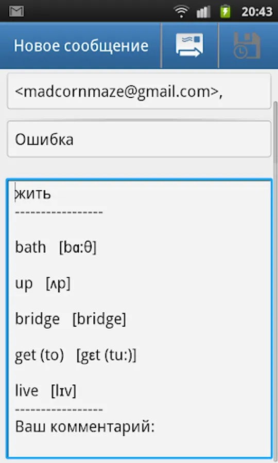 Now you can report a bug in the dictionary just a few clicks. To do this in the window of the test button is added, which causes the e-mail application with a letter, which is automatically generated text message to a bug. You can also append comments to send letters. After checking your messages, fix will be available in the immediate updating of the program.