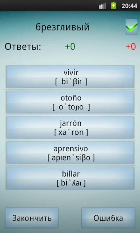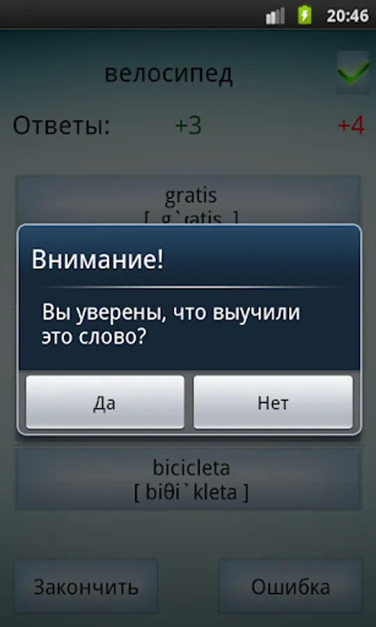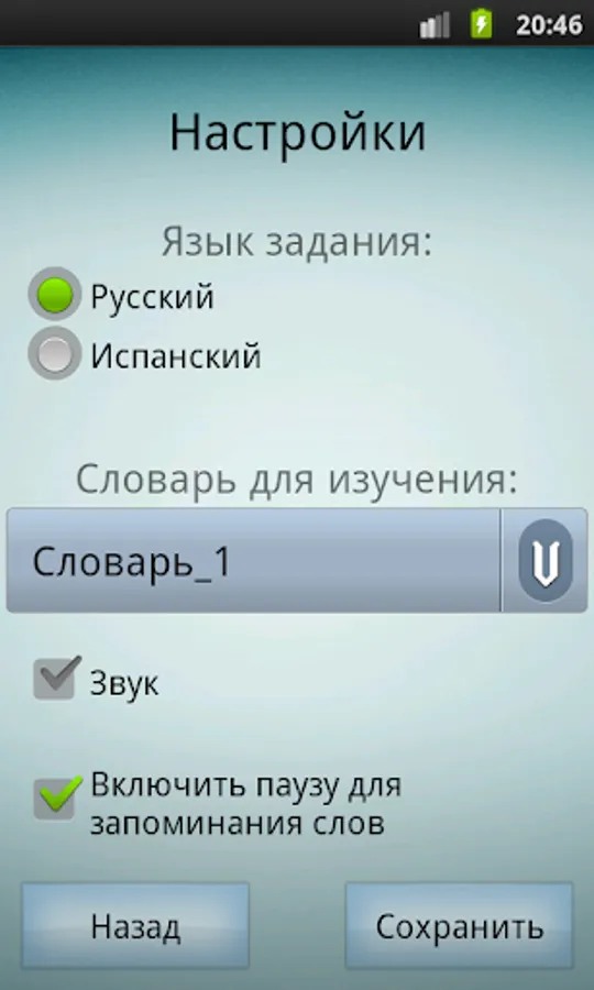 The application has the ability to pause to remember the words. If you wrongly mark the word, before you will be given a new word, you will see a box with the word in Spanish and Russian languages, as well as its transcription.