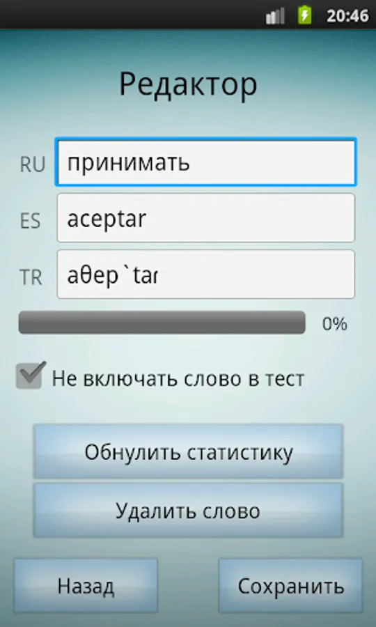 The user can immediately while passing the test mark the words that he already knows. To this end, next to the button is added to the studied words, which can be noted that the word no longer appeared in the test. Thus, when calculating the percentage of scrutiny of the word dictionary is added as a study. If the user changed his mind and wants to return the word to the test, just go to the appropriate dictionary to find the word in the editor and uncheck study. After saving, the word appears again in the test.