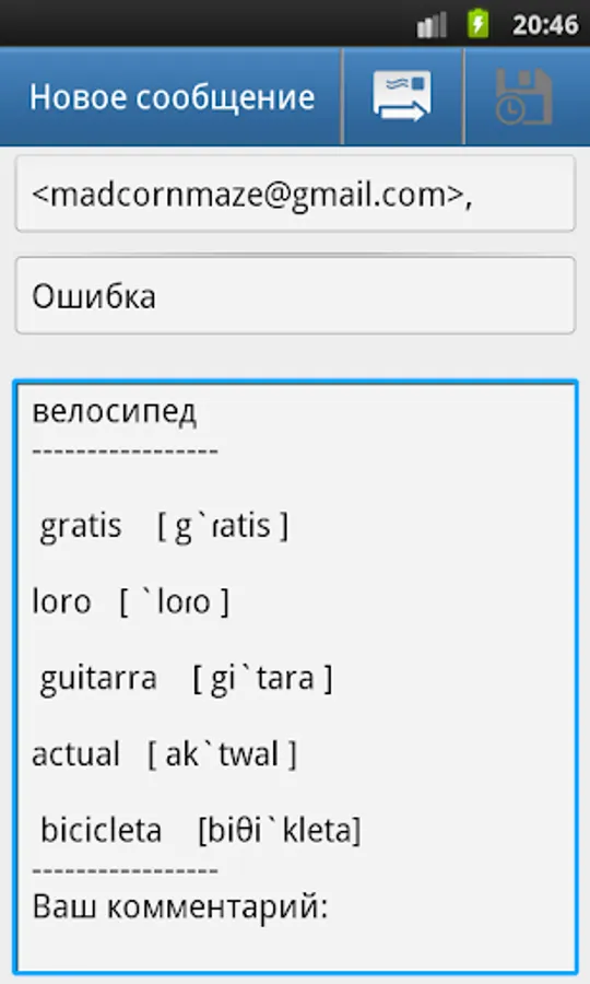 Now you can report a bug in the dictionary just a few clicks. To do this in the window of the test button is added, which causes the e-mail application with a letter, which is automatically generated text message to a bug. You can also append comments to send letters. After checking your messages, fix will be available in the immediate updating of the program.
