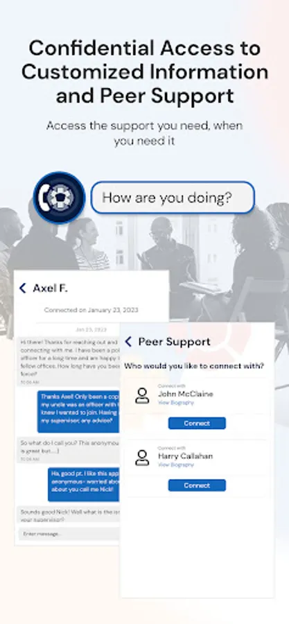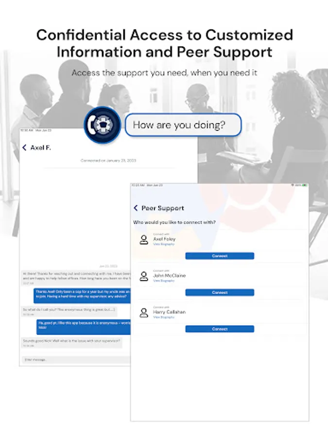 PeerOnCall is a peer support app designed by and for Canadian public safety personnel. It provides information and support for managing users’ mental health with resources, tips to cope, and peer wisdom videos. Users can also connect to trained peer supporters of their choice via secure, private text or voice chat. PeerOnCall is not intended to replace crisis services or professional support; however, local resources and supports can be found throughout the app. All information is private and confidential.