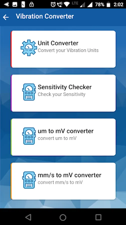 - Velocity conversion between inch/s and mm/s (RMS, 0-peak & peak-peak)