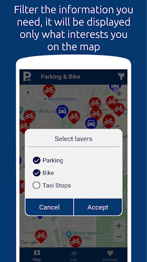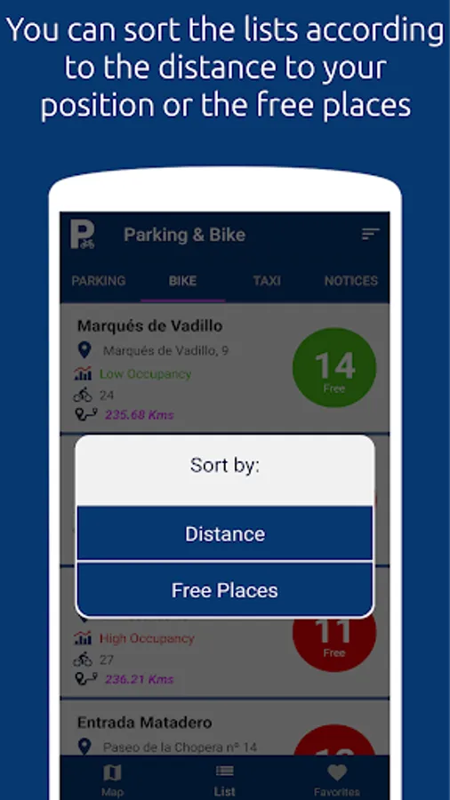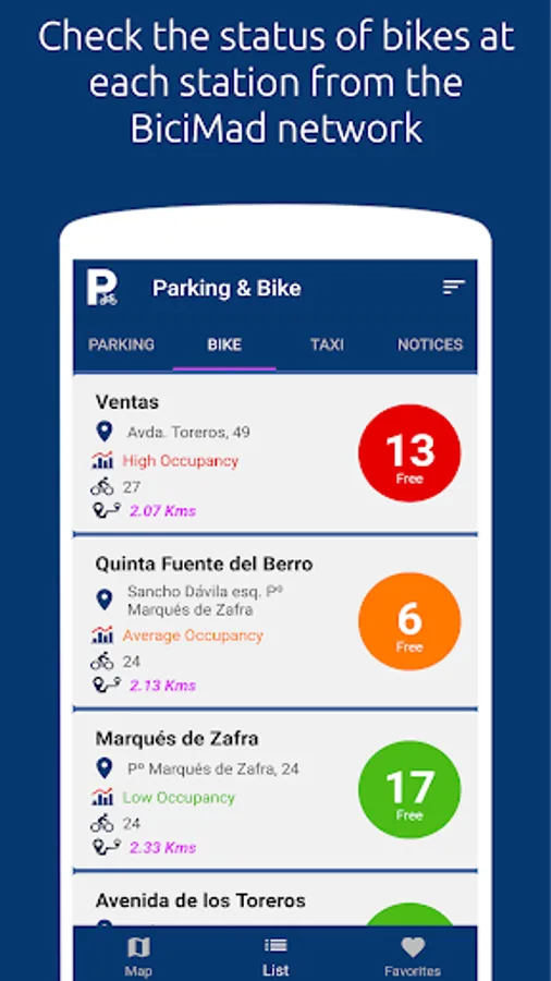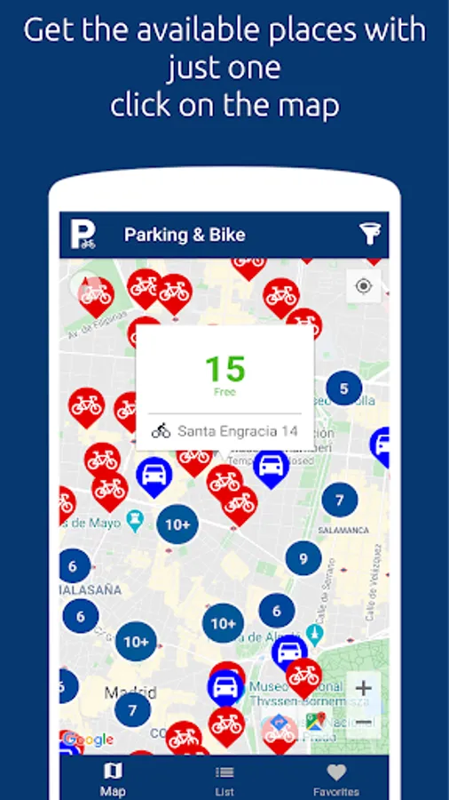 With Parking And Bike you will be able to check the availability of places in the public car parks of the city of Madrid, as well as the availability of bicycles for the different stations of the BiciMad network. In addition, all the Taxi stops in the city are available, in order to facilitate your access to any of these services.