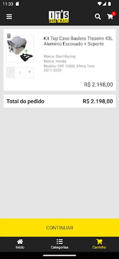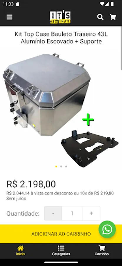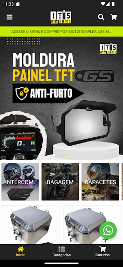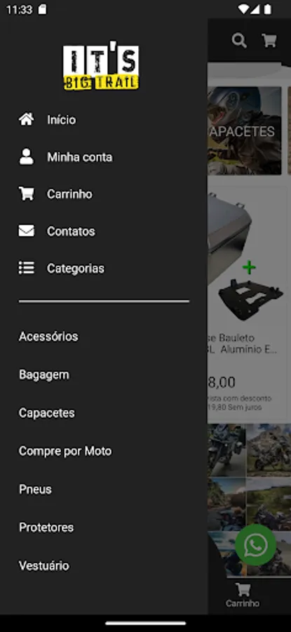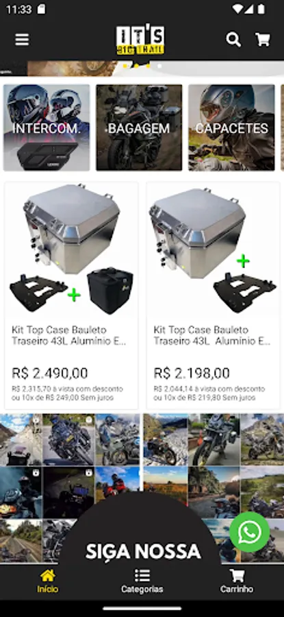 The It's Big Trail Application simply and quickly connects you to the Adventure-Touring and Off-Road world. We have everything you need for your adventure on two wheels: Accessories, Equipment, Clothing, among other varieties of products. We work with the best brands. There are more than 5 thousand products available in our catalog for prompt delivery. All in up to 10 installments without interest and we deliver all over Brazil. Take advantage of our exclusive discounts, activate notification alerts on your cell phone so you don't miss any offers!