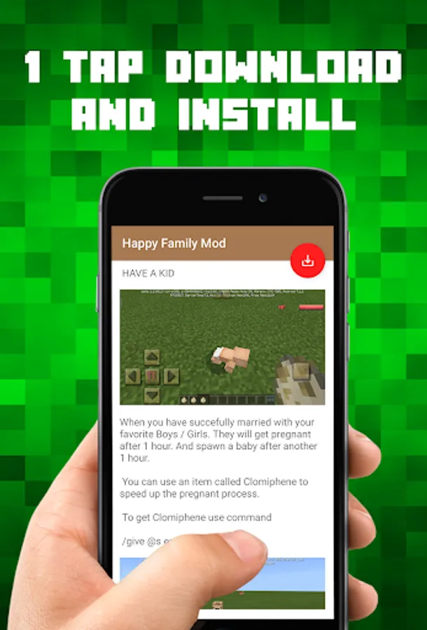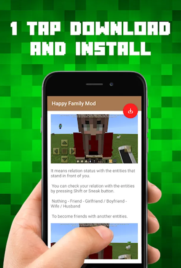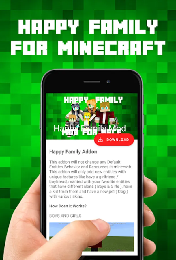 This Happy Family Mod for Minecraft PE application help you download & install Happy Family Addon into your Minecraft Pocket Edition game. Forget all those File Explorer or BlockLauncher, and get things done faster and easier with our 1 tap installer.