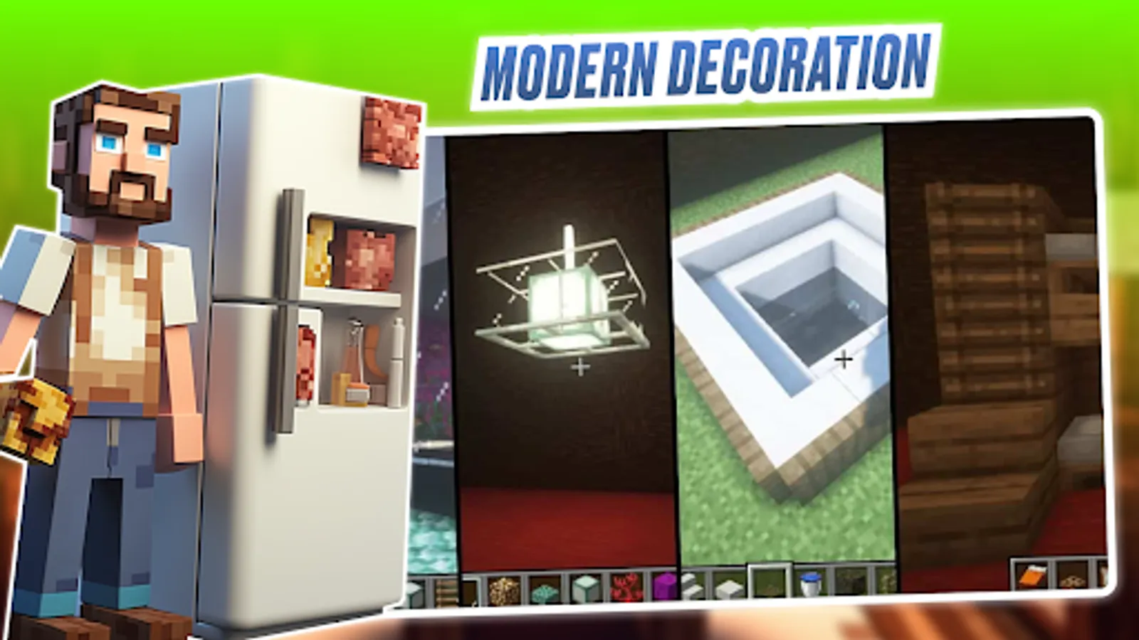Decocraft Mod for MCPE Bedrock is an addon that will allow you to apply all your skills as a designer and architect. Furniture mod for Minecraft will give you all the possibilities for this. Use all deco craft decorations to make your house complete and fit for life in it. Call your friends and build together, because we made these mods / addons in MC Pocket Edition for you!