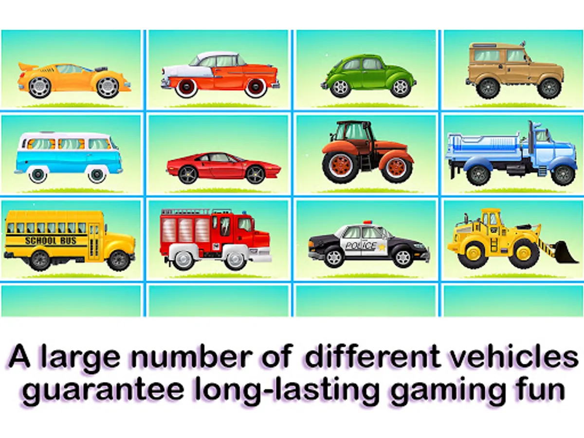 This fantastic car children's game contains three beautiful and high-quality car & truck vehicles games for children aged 2 to 8 years.