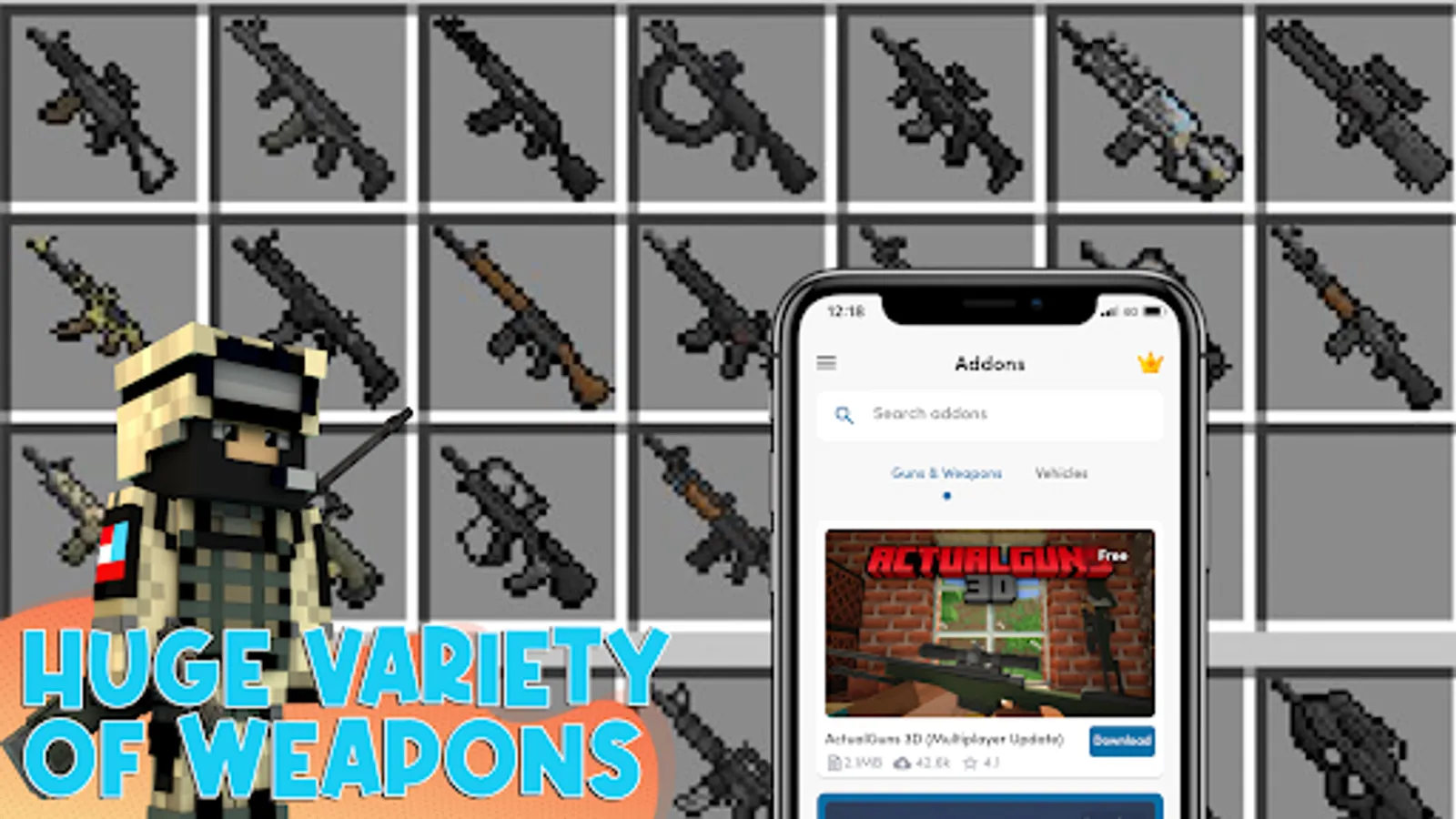 Guns and Weapons Mods for Minecraft PE offers you a large number of popular mods/addons for MCPE.
