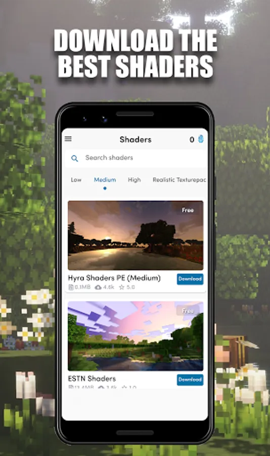 Shaders for Minecraft PE offers you all the popular shaders/texturepacks you need. Shaders are mods/addons for Minecraft, which make your game look much better.