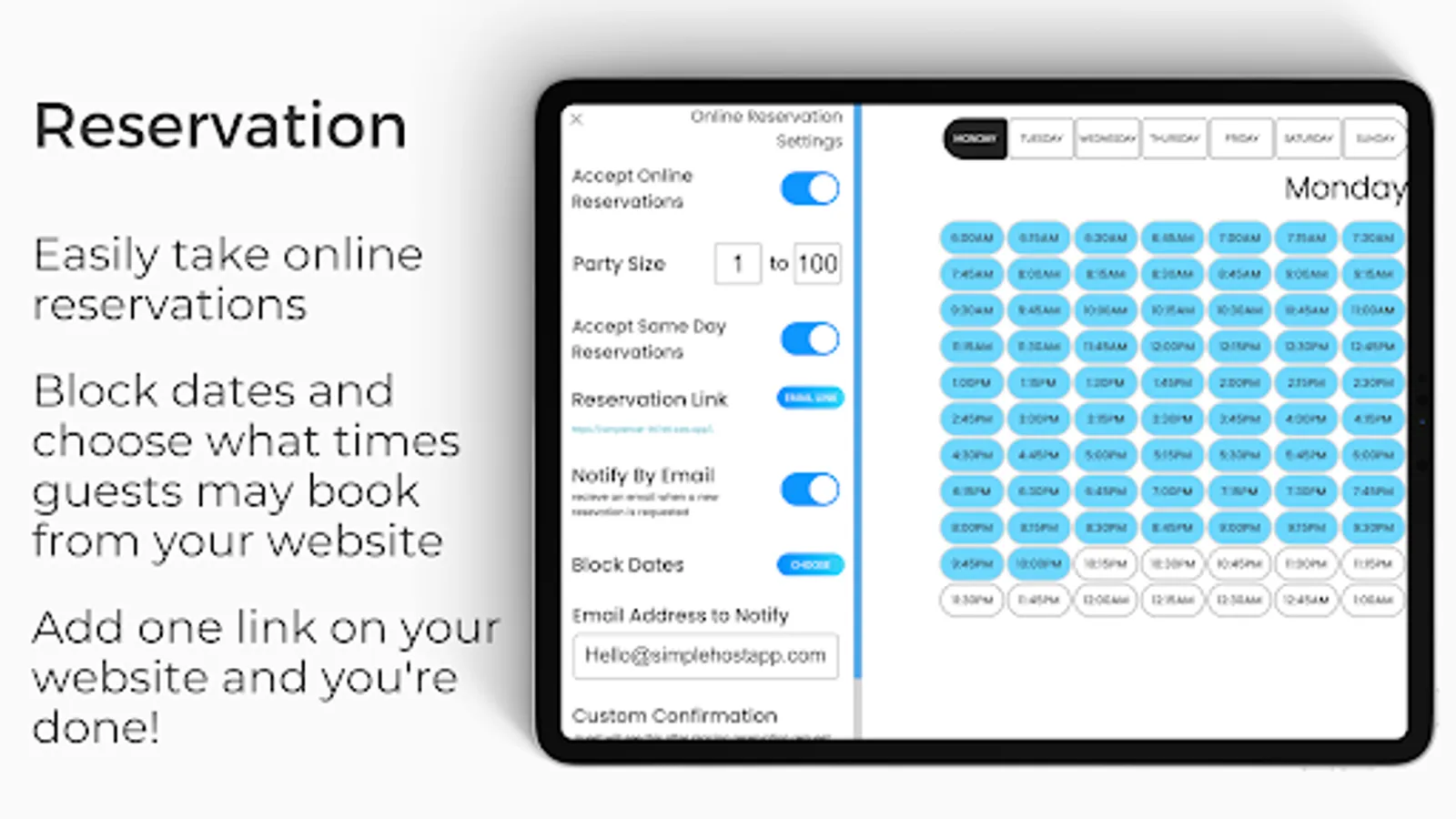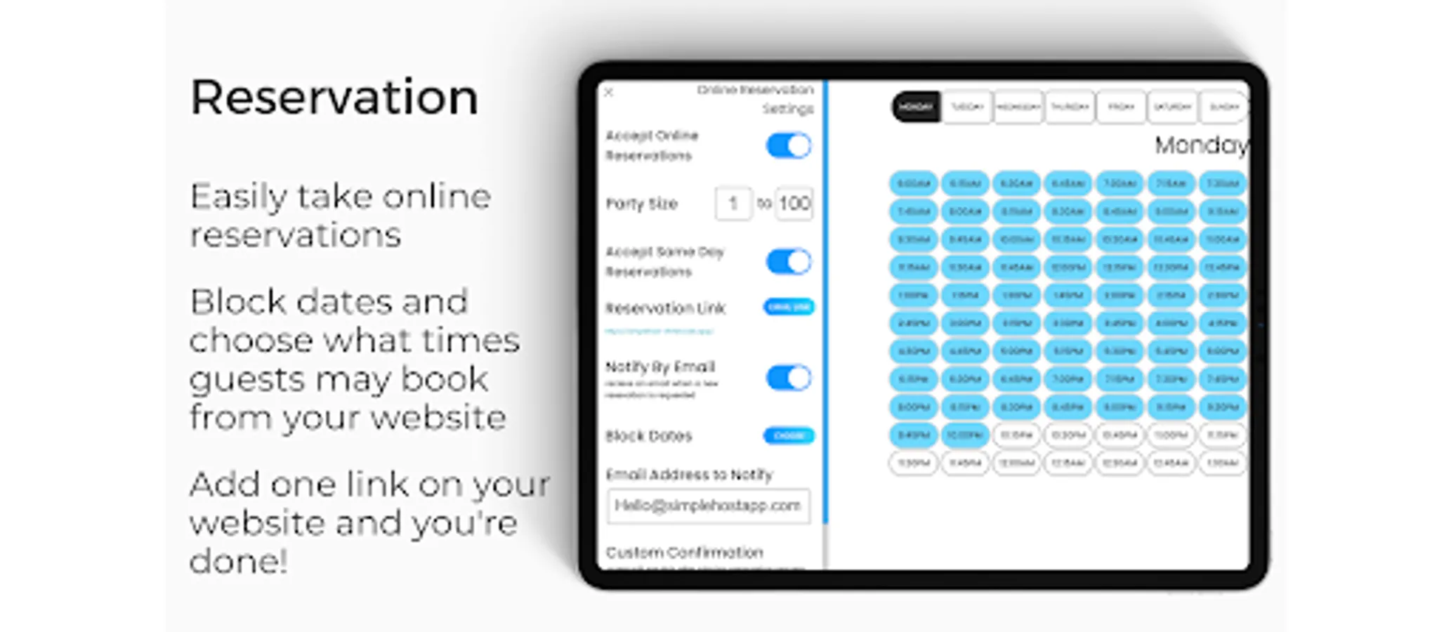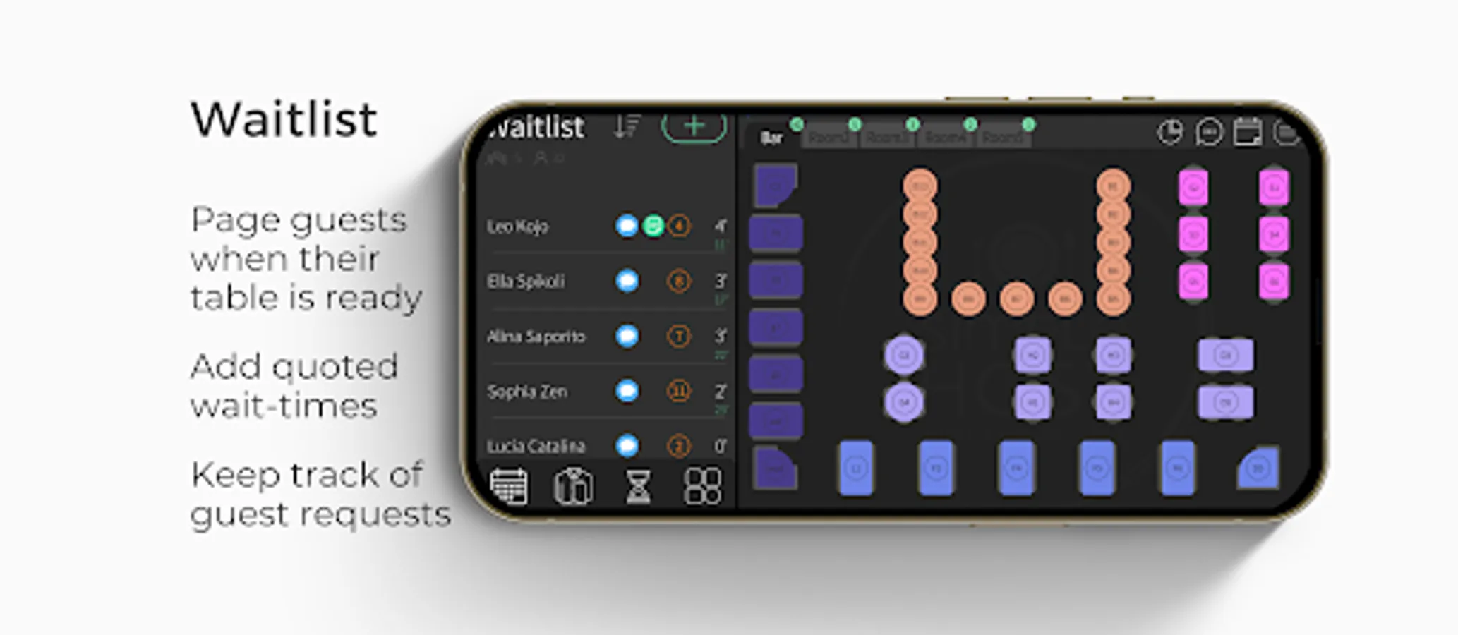 Simple Host is the app with the best features to help run your restaurant organized and stress free in the front of house. From dining room customization, online reservations, waitlisting and text communication with your guests, you will be able to keep your restaurant smooth sailing.