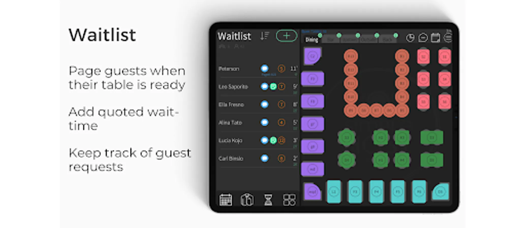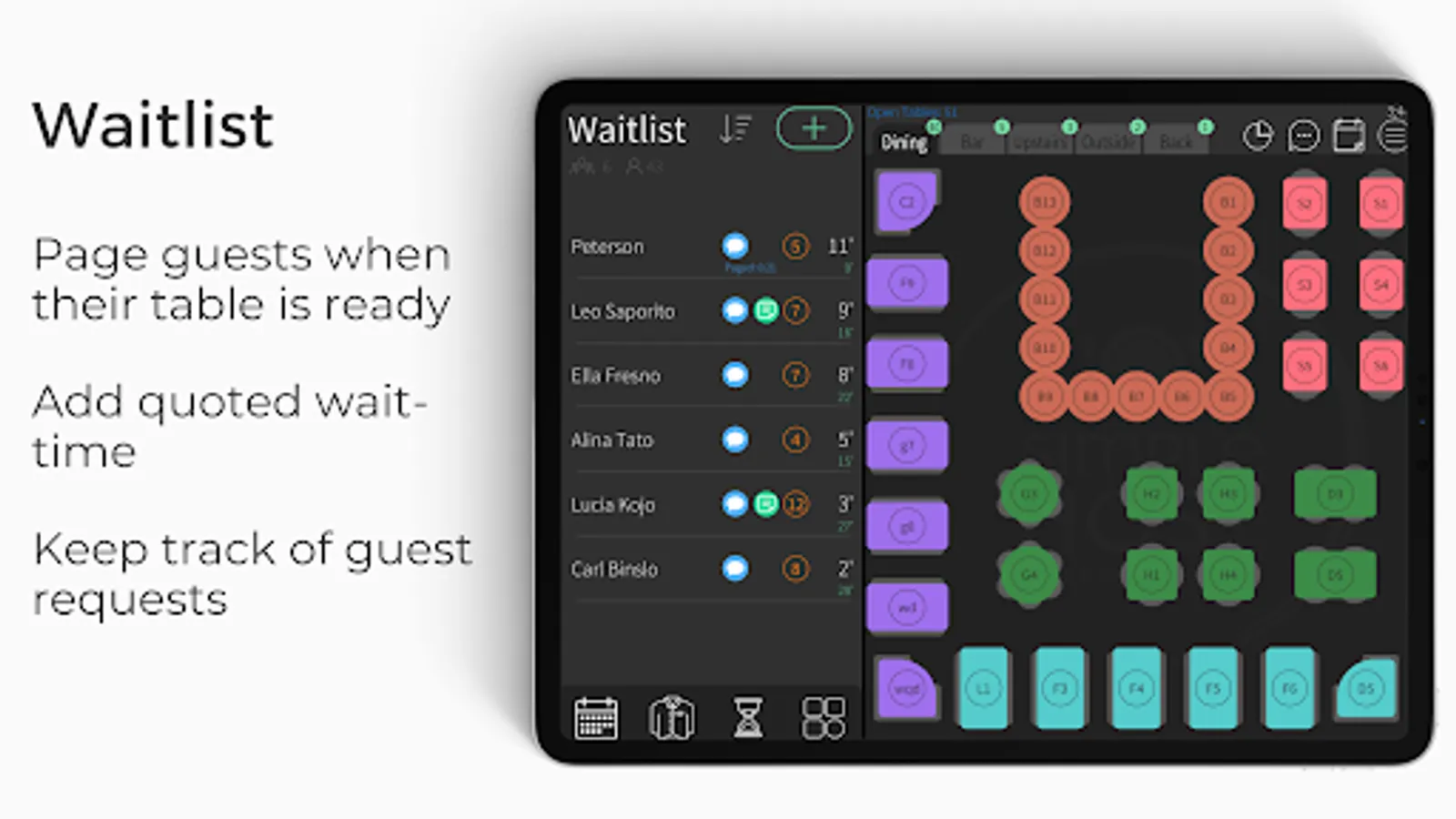 Keep your evening on track and guests content with the convenient waitlist section. Take parties, any special requests and page your party when their table is ready.