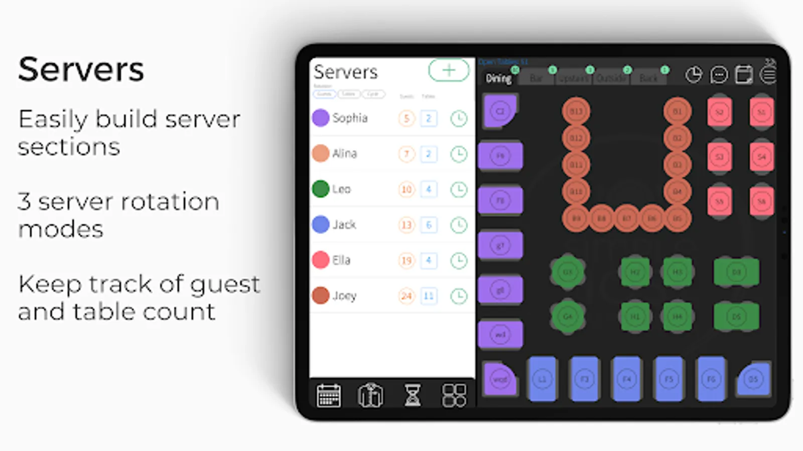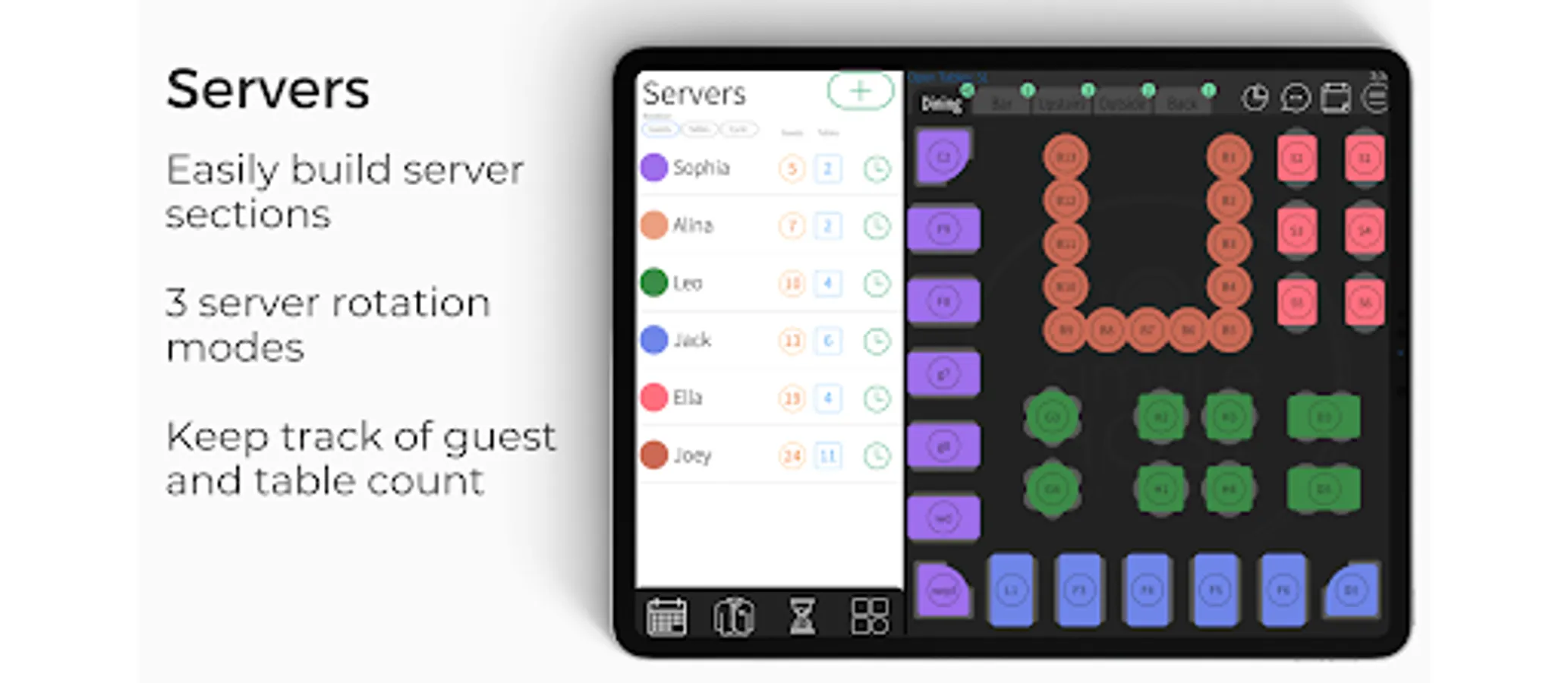 Add all waiters/waitresses to your servers list. With a special clock-in clock-out feature you will never be mistaken of who is available to take tables. The server with the least amount of guests will move to the top of your list so you’re aware which server is next to take a table. Two other rotation modes are available.