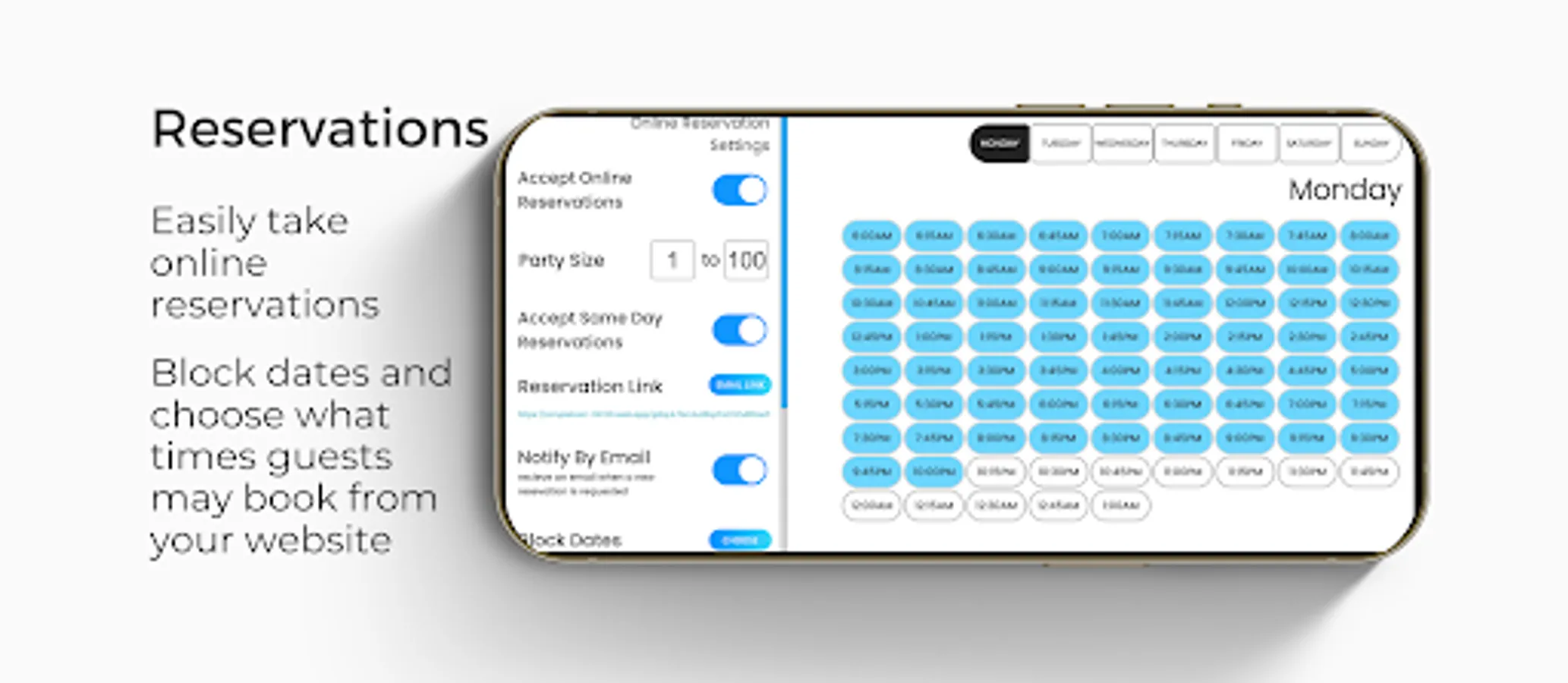 Stay organized and up to date with your reservations coming up. Choose the specific date and time your reservation plans to come. Add the amount of guests, a phone number and any requests needed for your party. Once booked, a reminder text message will let your party be aware of their booking. A second text message can be sent on the day of reservation when the table is ready. Take online reservations just by adding a link onto your website. You can configure all of the dates, times and largest group size from the app.