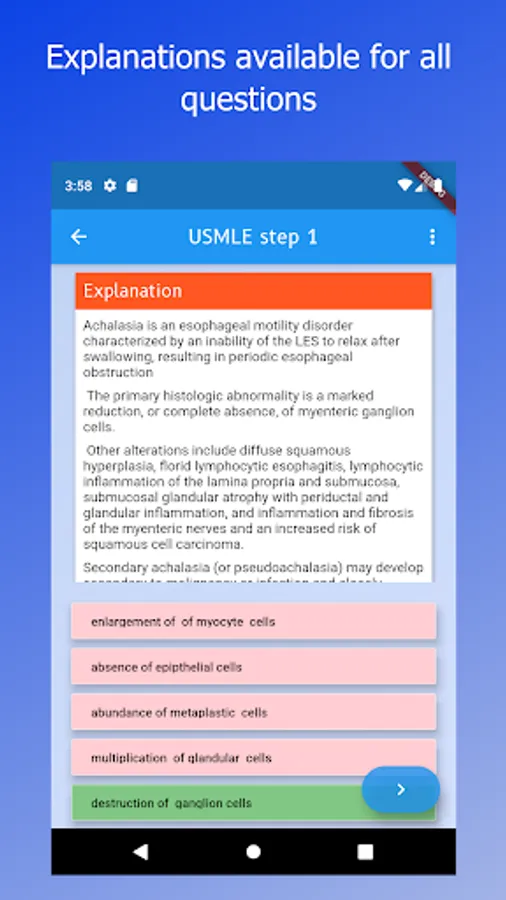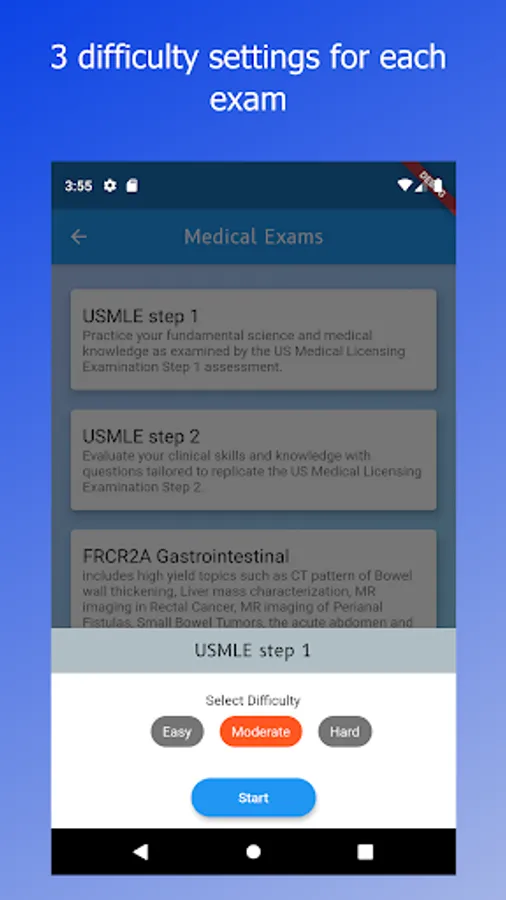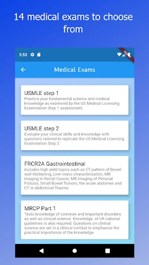 Includes questions for Medical exams such as the USMLE Step 1, USMLE Step 2, MRCP Part 1, PLAB, FRCR part 1 Image Viewing and FRCR Rapid Reporting exam, FRCR Physics, FRCR part 2a.
