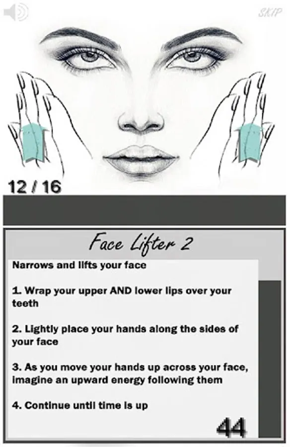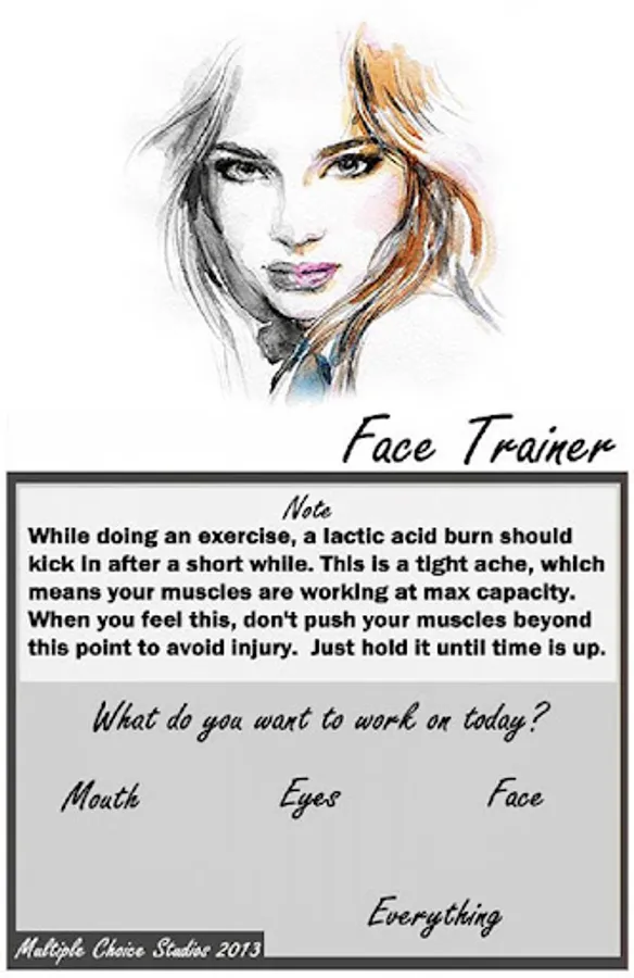 Face Trainer provides a dozen different timed exercises to provide for an easy-to-follow face training program.