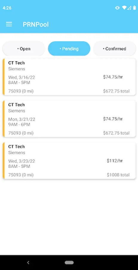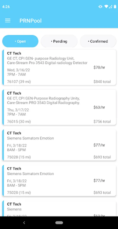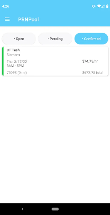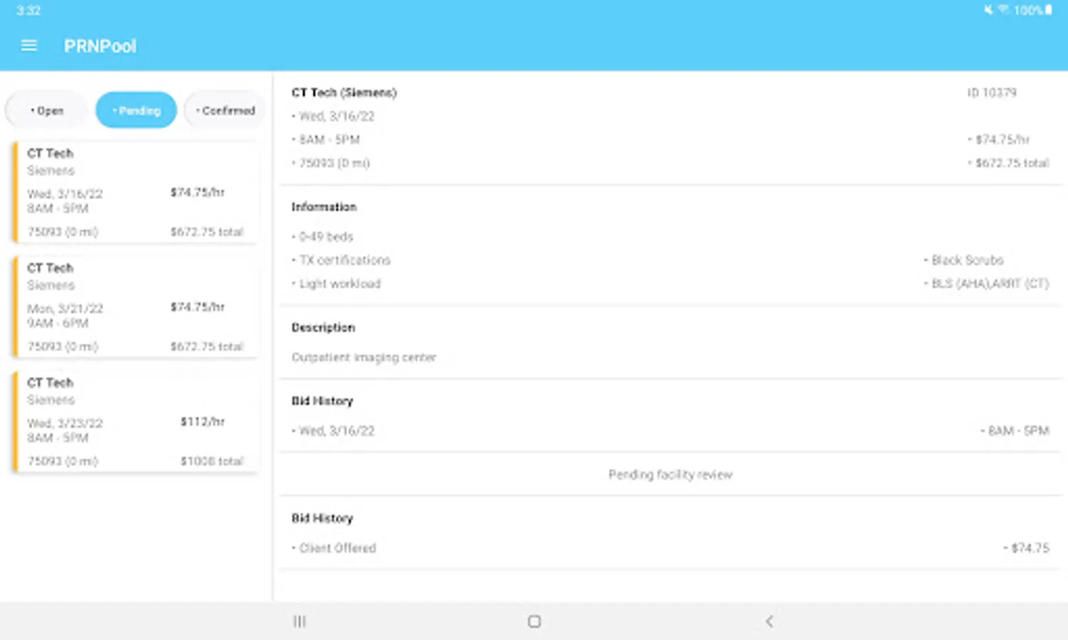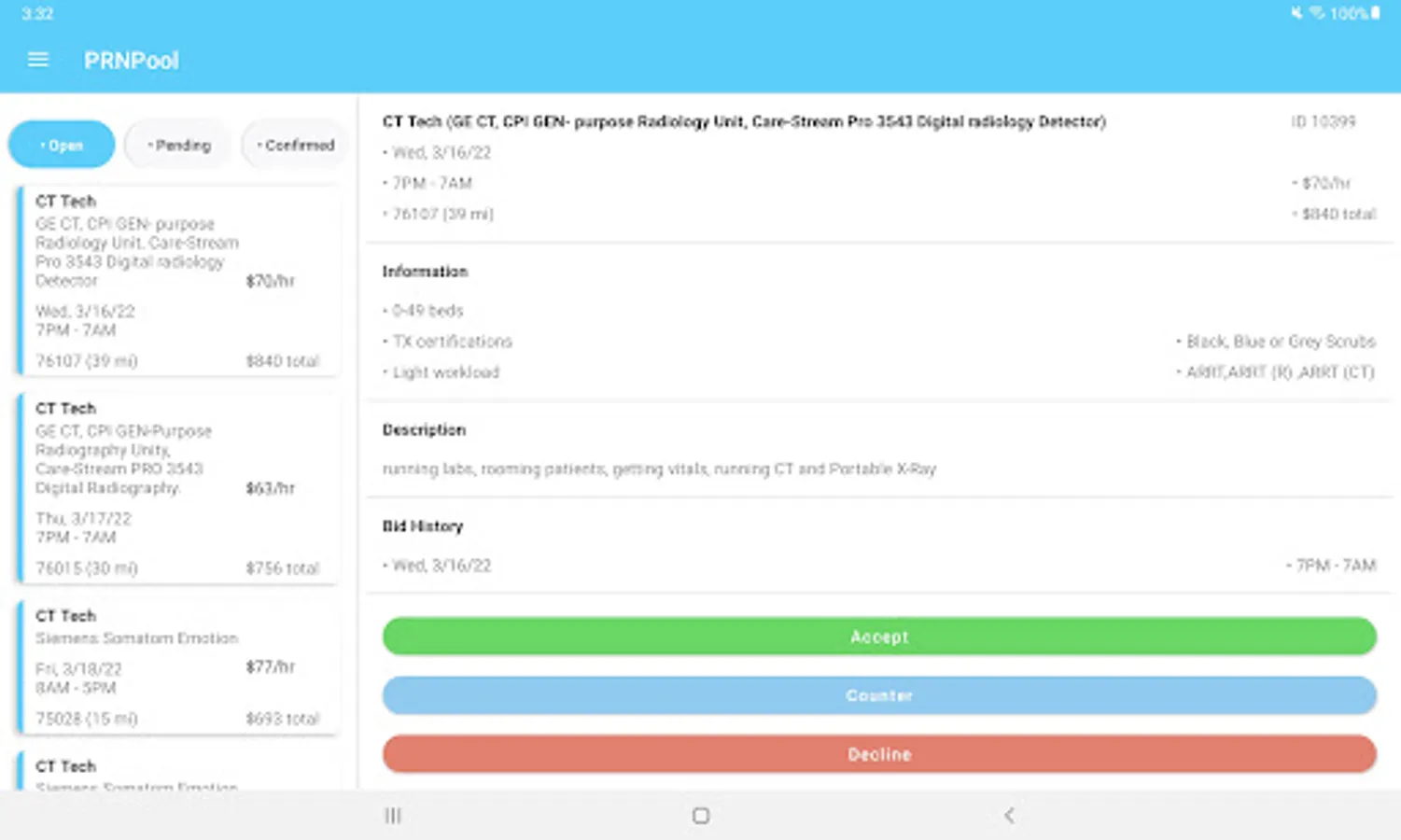The PRNPool mobile application allows professionals to review shifts, control contact options, and accept, decline, or counter on available shifts. If accepted for a shift, also allows the professional to check in, so PRNPool is notified that they are at the assignment.