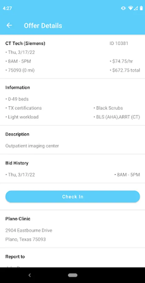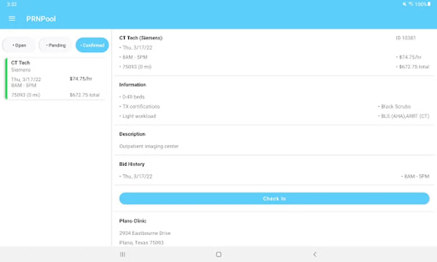 Final Detail screen showing above, plus actual address of facility and who to report to at the facility. Also on the final detail screen is the “Check In” feature, which notifies PRNPool you have reached the assignment.