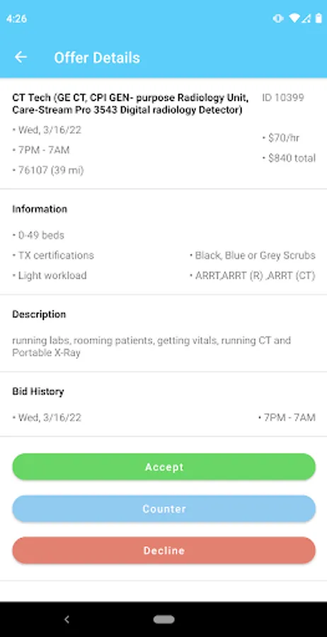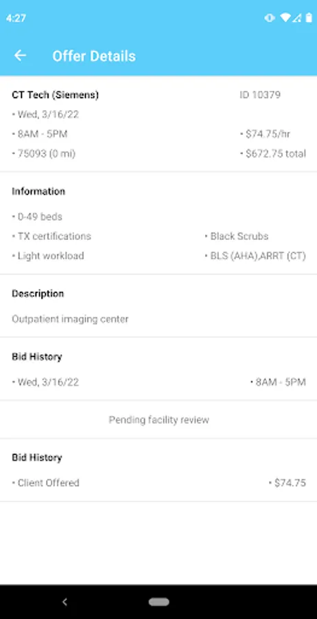 Detail screen showing skill, equipment, rate, date, hours, facility size, dress code, certifications, registrations, workload, and other pertinent information for the shift selected.