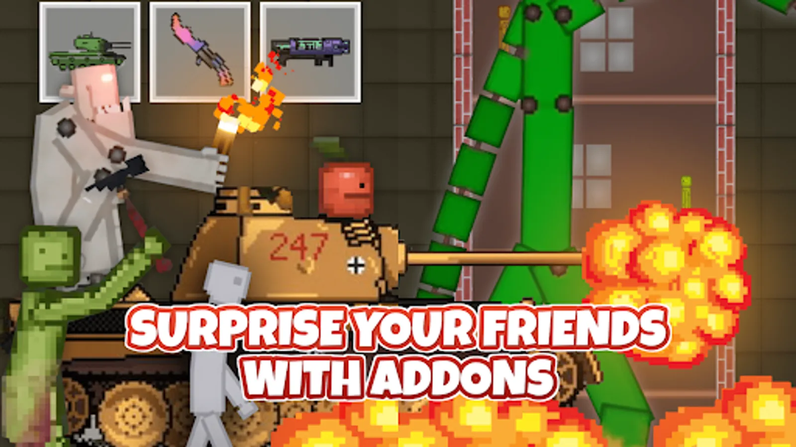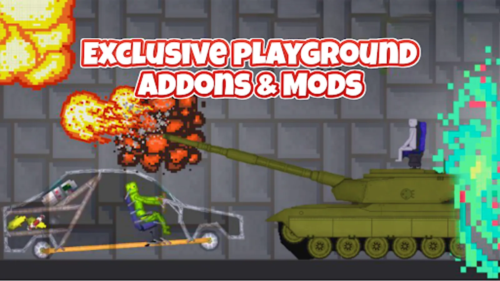 Big room with unlimited freedom of action, experimental physics and an impressive collection of tools, characters and scenery. You can do whatever you want with our wide variety of mods. With our Mods for Melon Playground you can use your creativity to the maximum possibility. Game area give players many choices to create different character incidents between items. No matter where are you on the room you will be a part of a big experiment with car crashes, tanks and weapons, dinosaur appearing, big buildings with tons of furniture. We have collected the most interesting mods on various topics such as: weapons, animal mods, cars mod, furniture, tanks and technics, different buildings and many other. You have possibility to own many unique weapons to take down random obstacles. If you are looking for Melon Playground Mods that challenging and fun you deffinitely try our app !