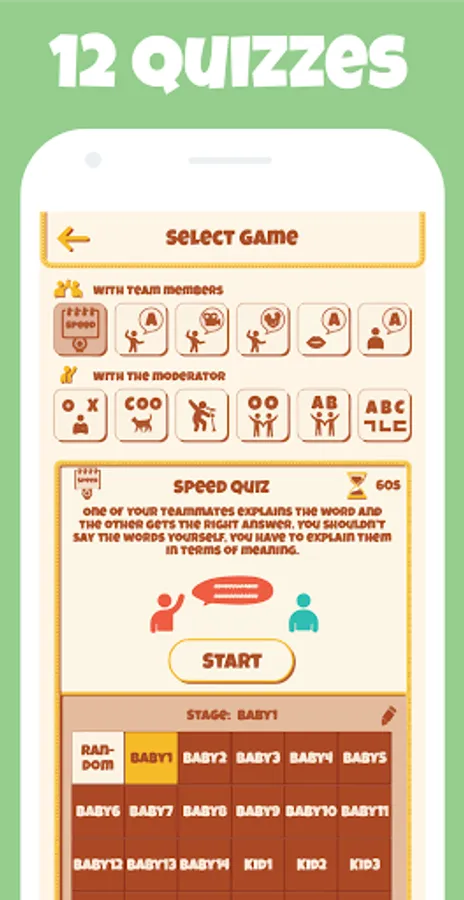 -Speed Quiz: One of your teammates explains the word and the other gets the right answer. You shouldn’t say the words yourself, you have to explain them in terms of meaning.