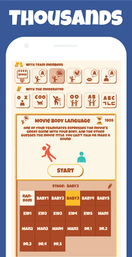 -Body language: One of your teammates expresses the words with your body, and the other gets the correct answer. You can’t talk or make a sound.