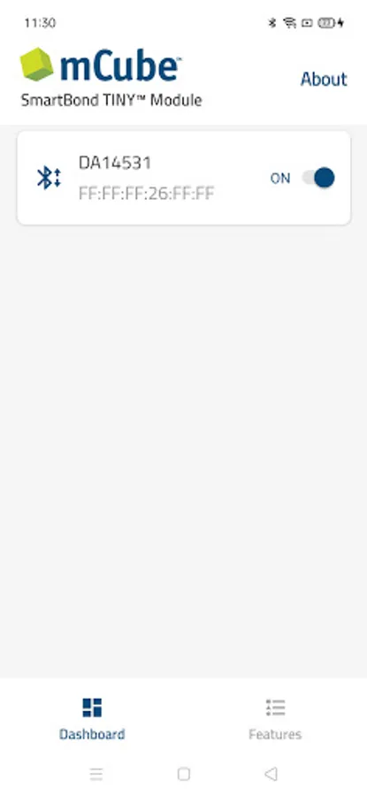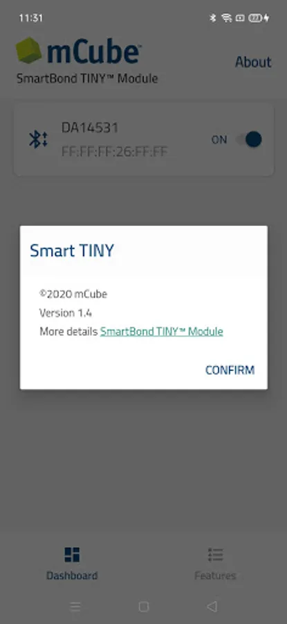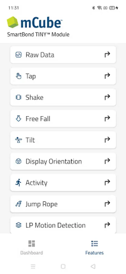 The SmartBond TINY module is a 3-axis accelerometer sensor module with wireless connectivity. It provides sensor data and some algorithm results, such as: Tap, Shake, Free Fall, Tilt, Display Orientation, Jump Rope, Low-Power montion detection.