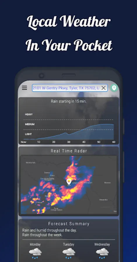 Unlike other weather apps, our app displays weather minute by minute. You can easily track the weather in