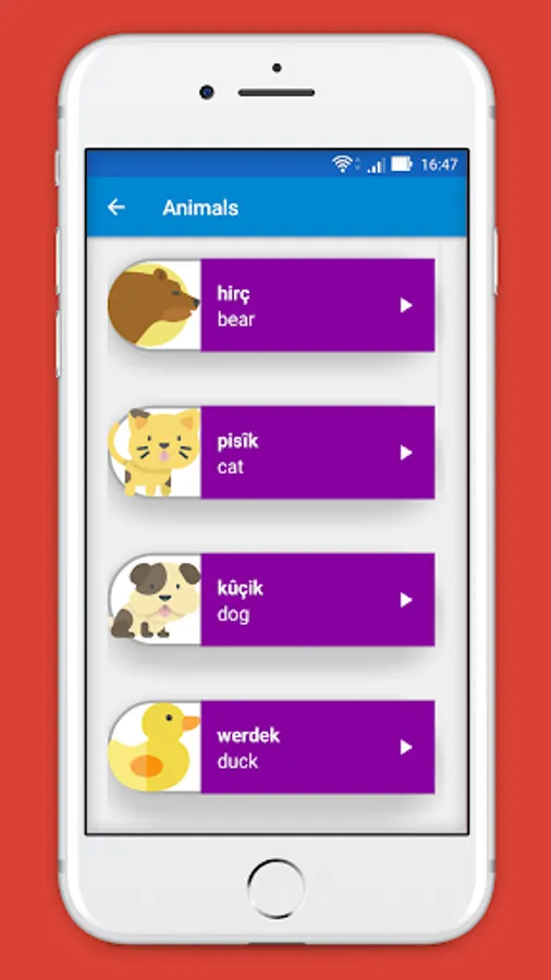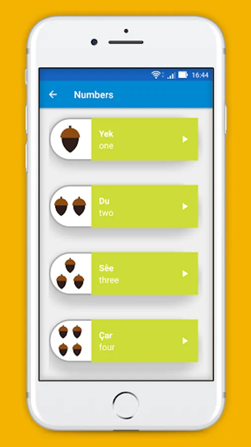 Numbers, Family, Colors, Sentences, Weather, Fruit, Shopping, Time, Calendar, Occupation, Body, Health, Emergency, Direction, Food, etc ....