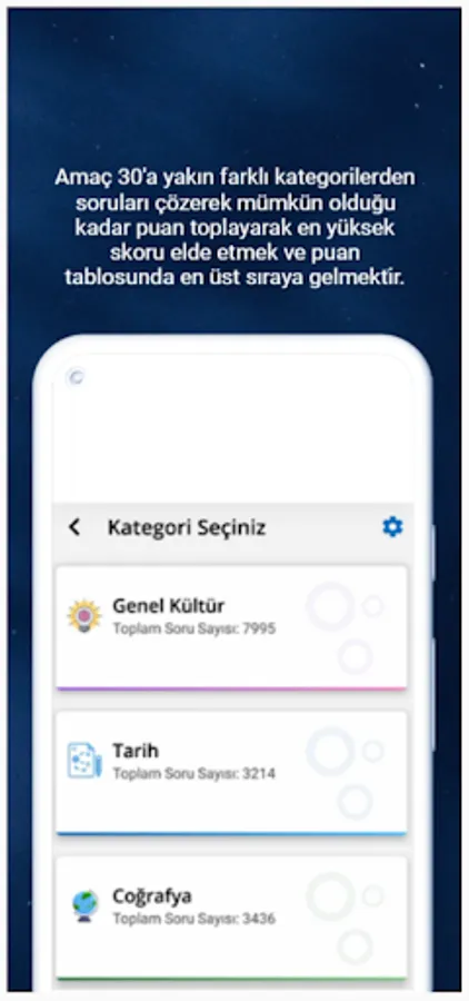 The aim of Quiz - Knowledge Contest is to get the highest score by solving questions from nearly 30 different categories and collecting as many points as possible and to come to the top of the scoreboard.