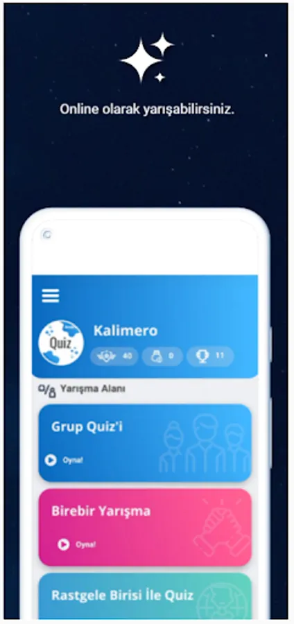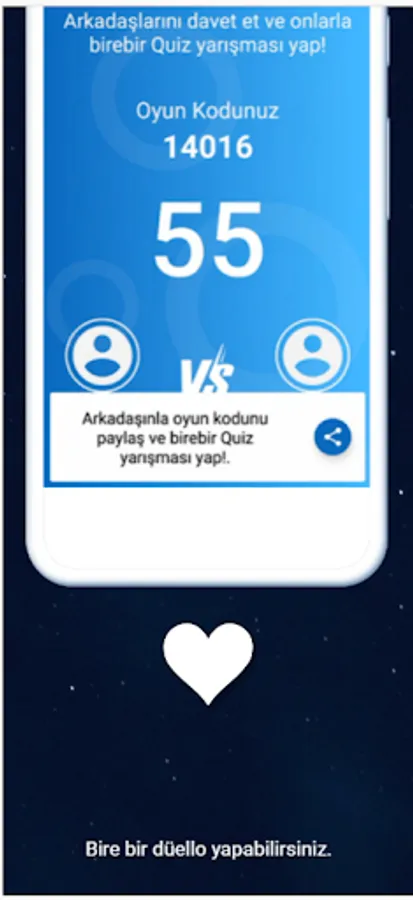 With Quiz - Quiz, you can compete with your friends online one-on-one. You can create a room and invite your friend with the one on one competition option.