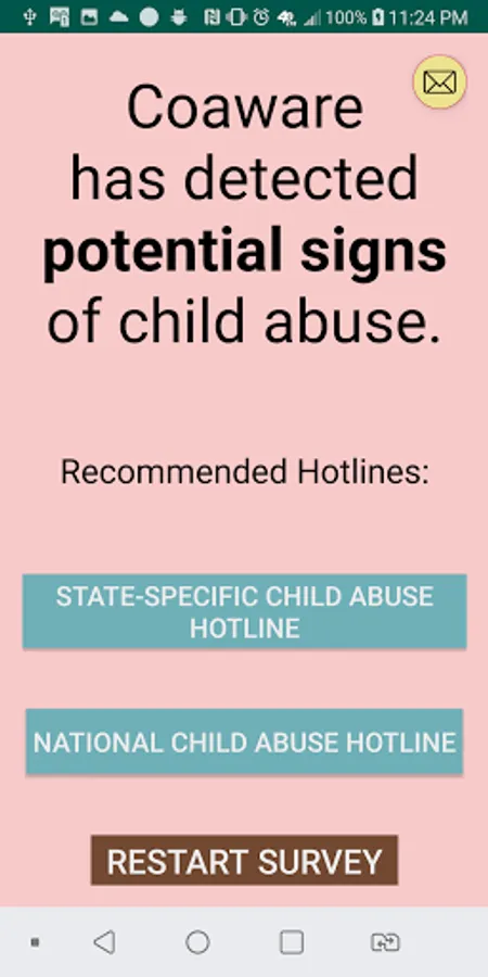 Our application, Coaware, has two simple tabs designed for child abuse: Signs and Symptoms, along with Emergency Contacts.